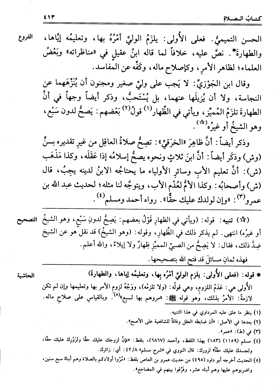 الْحُسَيْنِ التَّمِيمِيُّ، فَعَلَى الْأُولَى يَلْزَمُ الْوَلِيَّ أَمْرُهُ بِهَا وَتَعْلِيمُهُ إيَّاهَا وَالطَّهَارَةَ، نَصَّ عَلَيْهِ خِلَافًا لِمَا قَالَهُ ابْنُ عَقِيلٍ فِي مُنَاظَرَاتِهِ وَبَعْضِ الْعُلَمَاءِ لِظَاهِرِ الْأَمْرِ، وَكَإِصْلَاحِ مَالِهِ، وَكَفِّهِ عَنْ الْمَفَاسِدِ.