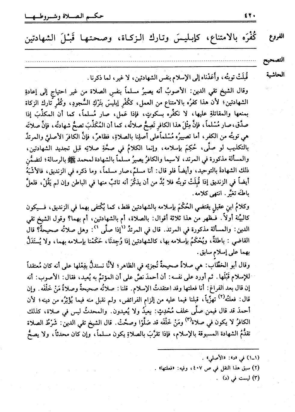 كُفْرَهُ بِالِامْتِنَاعِ كَإِبْلِيسٍ وَتَارِكِ الزَّكَاةِ، وَصِحَّتُهَا قَبْلَ الشهادتين