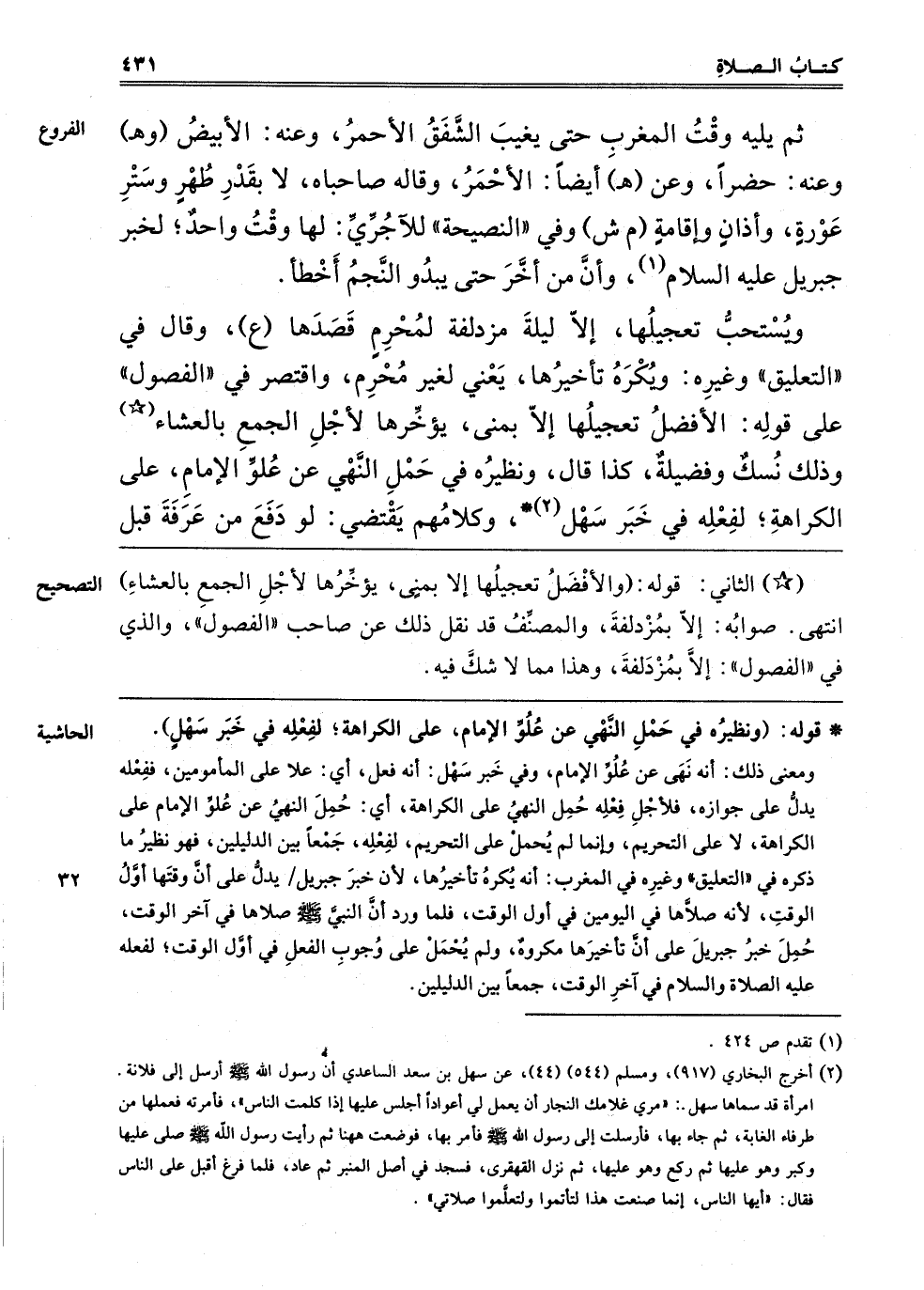 وَيُسْتَحَبُّ تَعْجِيلُهَا، إلَّا لَيْلَةَ الْمُزْدَلِفَةِ لِمُحْرِمٍ قَصَدَهَا إجْمَاعًا. وَقَالَ فِي التَّعْلِيقِ وَغَيْرِهِ: وَيُكْرَهُ تَأْخِيرُهَا، يَعْنِي لِغَيْرِ مُحْرِمٍ، وَاقْتَصَرَ فِي الْفُصُولِ عَلَى قَوْلِهِ: الْأَفْضَلُ تَعْجِيلُهَا إلَّا بِمِنًى "بِمُزْدَلِفَةَ" يُؤَخِّرُهَا لِأَجْلِ الْجَمْعِ بِالْعِشَاءِ وَذَلِكَ نُسُكٌ وَفَضِيلَةٌ، كَذَا قَالَ، وَنَظِيرُهُ فِي حَمْلِ النَّهْيِ عَنْ عُلُوِّ الْإِمَامِ عَلَى الْكَرَاهَةِ، لِفِعْلِهِ فِي خَبَرِ سَهْلٍ2، وَكَلَامُهُمْ يَقْتَضِي لَوْ دَفَعَ عَنْ عَرَفَةَ قَبْلَ