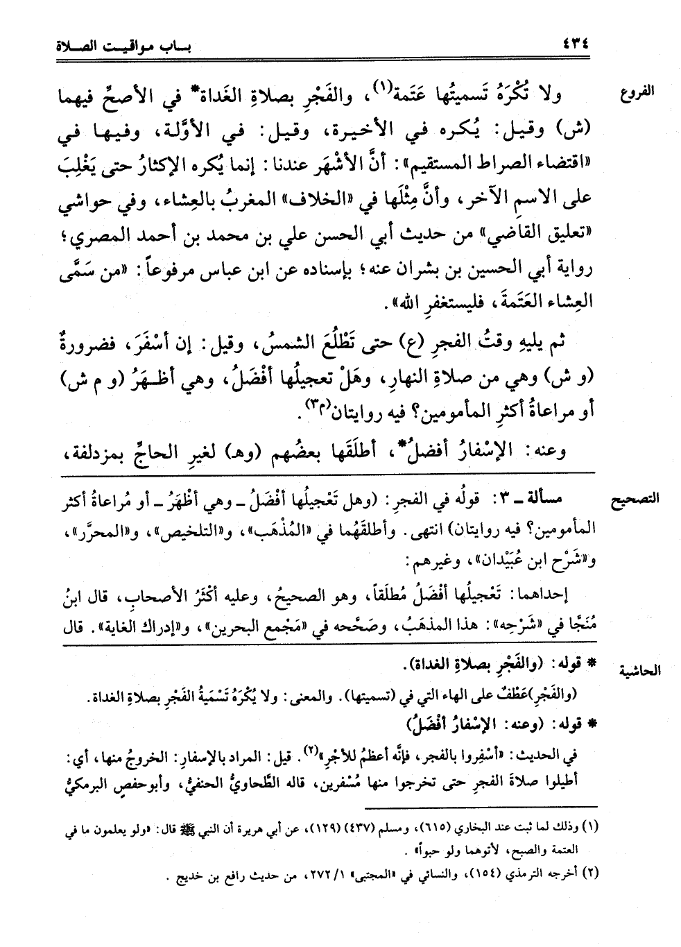 ثُمَّ يَلِيهِ وَقْتُ الْفَجْرِ "ع" حَتَّى تطلع الشمس، وقيل: إن أسفر فضرورة "وش" وَهِيَ مِنْ صَلَاةِ النَّهَارِ، وَهَلْ تَعْجِيلُهَا أَفْضَلُ؟ وهي أظهر "وم ش" أَوْ مُرَاعَاةُ أَكْثَرِ الْمَأْمُومِينَ؟ فِيهِ رِوَايَتَانِ "م 3".