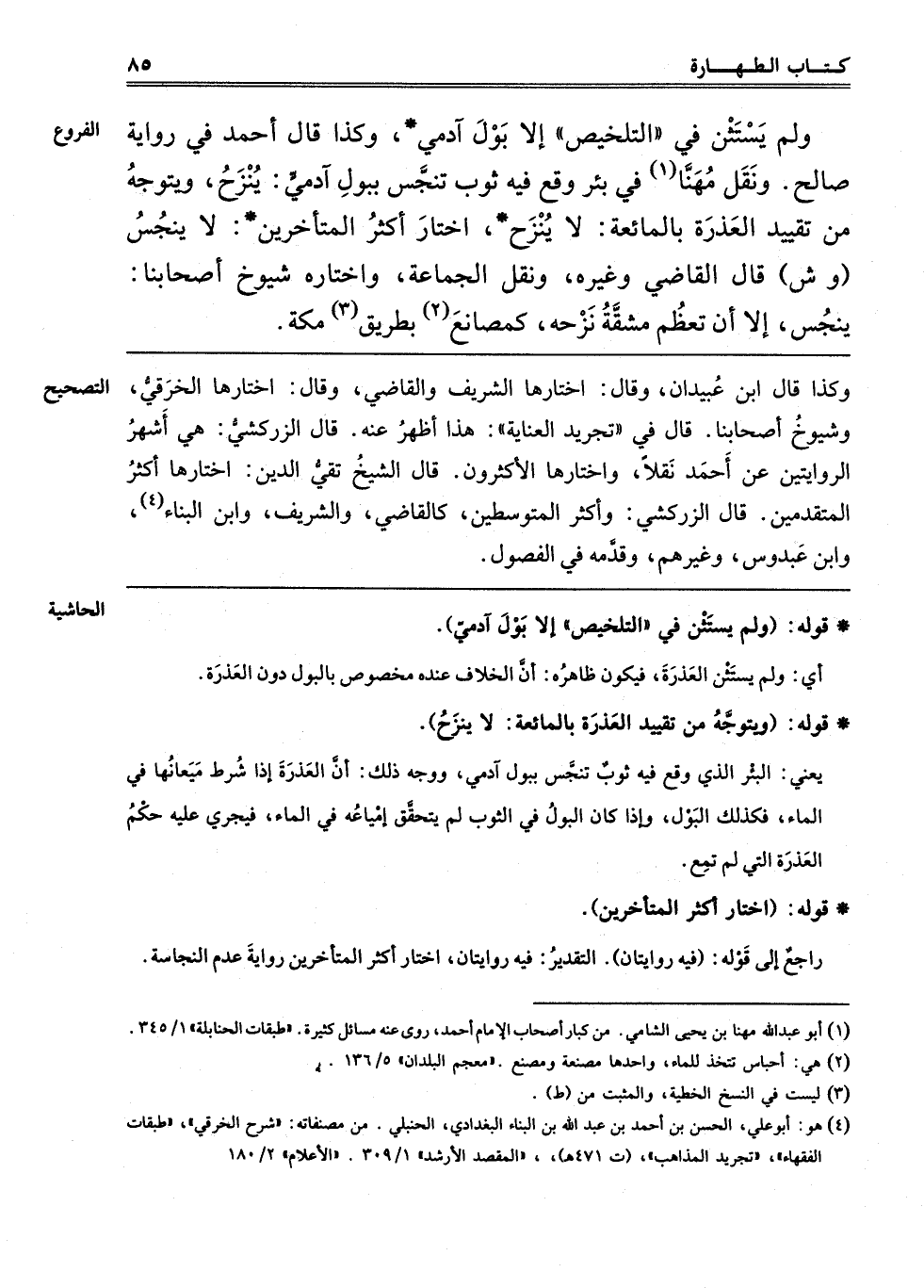 وَلَمْ يَسْتَثْنِ فِي التَّلْخِيصِ إلَّا بَوْلَ آدَمِيٍّ، وَكَذَا قَالَ أَحْمَدُ فِي رِوَايَةِ صَالِحٍ. وَنَقَلَ مُهَنَّا1 فِي بِئْرٍ وَقَعَ فِيهِ ثَوْبٌ تَنَجَّسَ بِبَوْلِ آدَمِيٍّ: يُنْزَحُ، وَيُتَوَجَّهُ مِنْ تَقْيِيدِ الْعَذِرَةِ بِالْمَائِعَةِ لَا يُنْزَحُ، اخْتَارَ أَكْثَرُ الْمُتَأَخِّرِينَ لَا يَنْجُسُ "وَ. ش" قَالَ الْقَاضِي وَغَيْرُهُ وَنَقَلَ الْجَمَاعَةُ وَاخْتَارَهُ شُيُوخُ أَصْحَابِنَا: يَنْجُسُ، إلَّا أَنْ تعظم مشقة نزحه كمصانع2 بطريق3 مكة.
