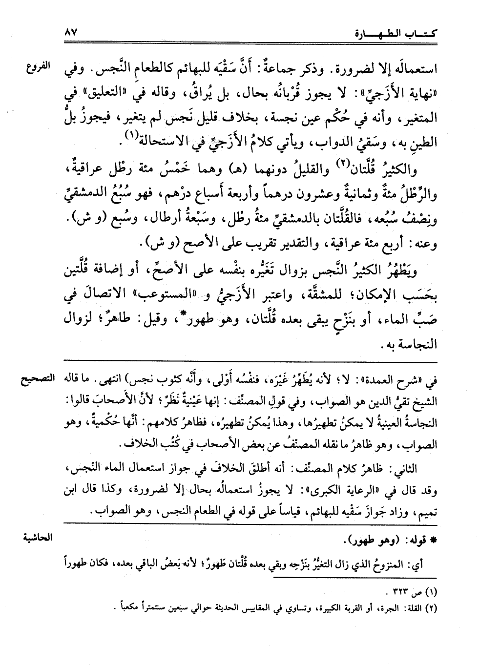 وَالْكَثِيرُ قُلَّتَانِ2، وَالْقَلِيلُ دُونَهُمَا "هـ" وَهُمَا خَمْسُمِائَةِ رِطْلٍ عِرَاقِيَّةٍ، وَالرِّطْلُ مِائَةٌ وَثَمَانِيَةٌ وَعِشْرُونَ دِرْهَمًا وَأَرْبَعَةُ أَسْبَاعِ دِرْهَمٍ، فَهُوَ سُبْعُ الدِّمَشْقِيِّ وَنِصْفُ سُبْعِهِ، فَالْقُلَّتَانِ بِالدِّمَشْقِيِّ مِائَةُ رطل، وسبعة أرطال وسبع "وش" وَعَنْهُ أَرْبَعُمِائَةٍ عِرَاقِيَّةٌ، وَالتَّقْدِيرُ تَقْرِيبٌ عَلَى الْأَصَحِّ "وش".