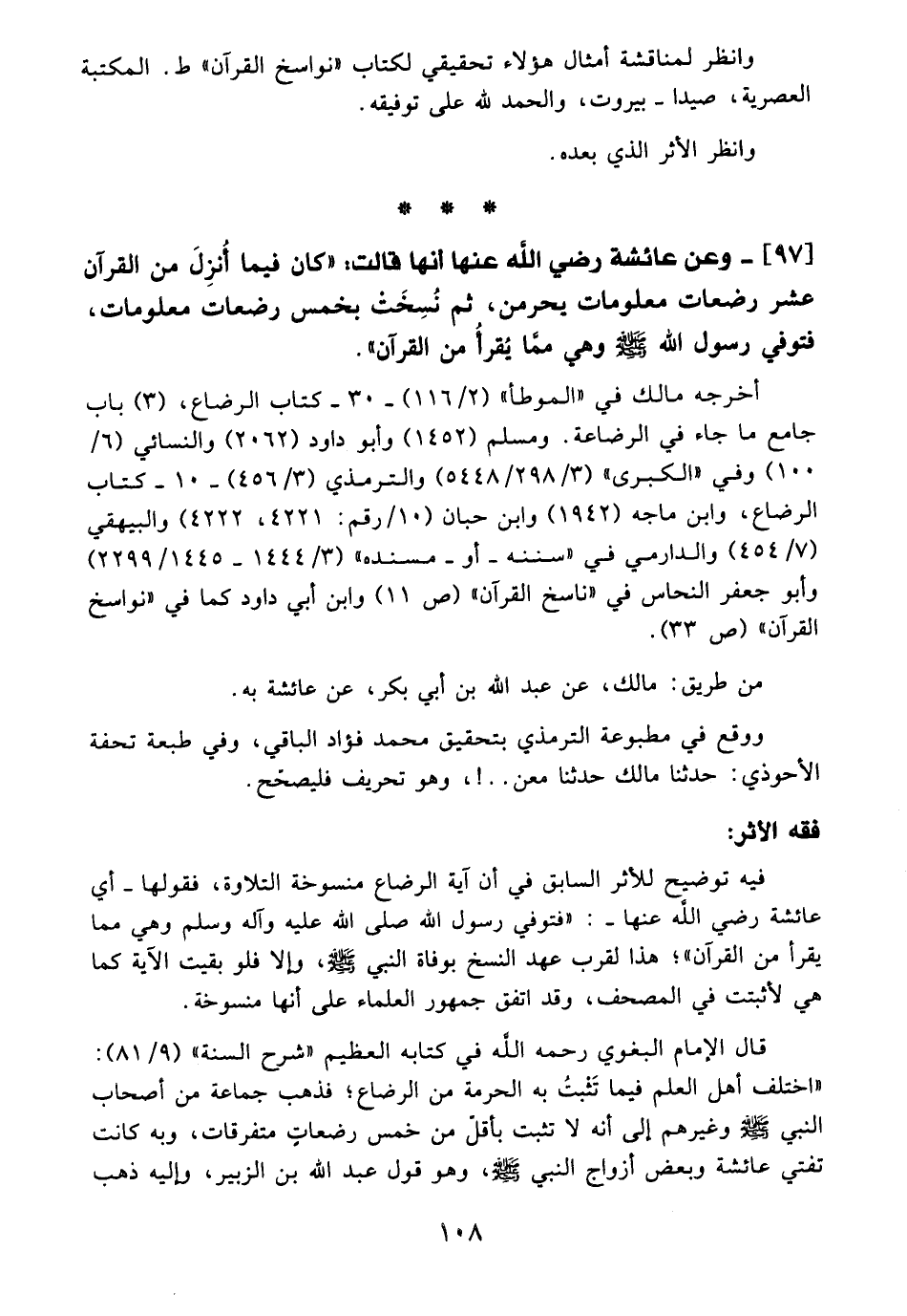 97 - وعن عائشة - رضي الله عنها - أنها قالت: "كان فيما أُنزِلَ من القرآن عشر رضعات معلومات يحرمن، ثم نُسِخَت بخمس رضعات معلومات، فتوفي رسول الله - صلى الله عليه وسلم - وهي ممَّا يُقرأُ من القرآن".