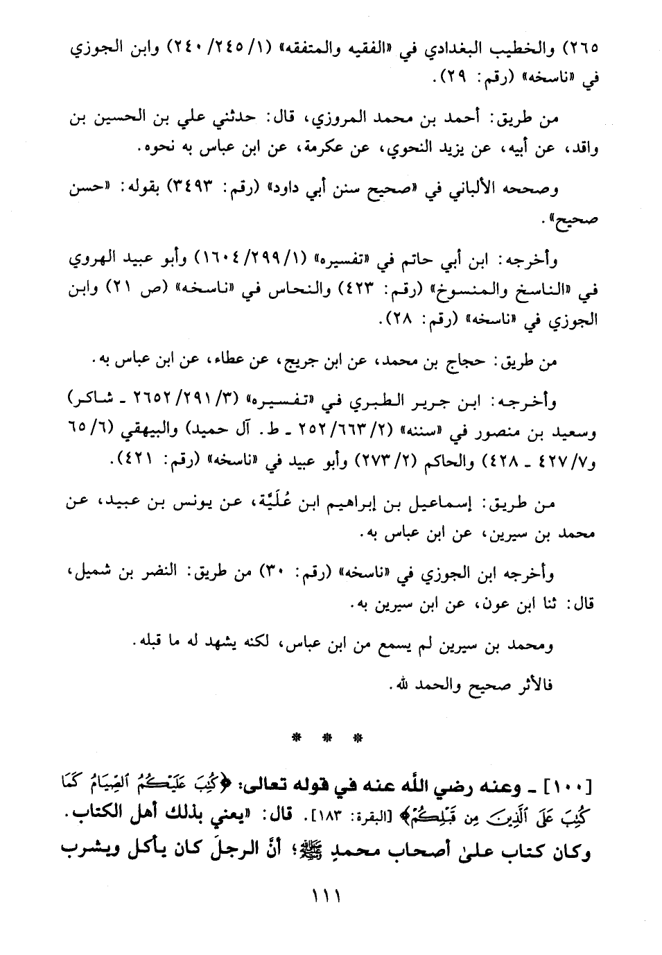 100 - وعنه - رضي الله عنه - في قوله تعالى: {كُتِبَ عَلَيْكُمُ الصِّيَامُ كَمَا كُتِبَ عَلَى الَّذِينَ مِنْ قَبْلِكُمْ} [البقره: 183]. قال: "يعني بدلك أهل الكتاب. وكان كتاب على أصحاب محمدٍ - صلى الله عليه وسلم -؛ أنَّ الرجل كان يأكل ويشرب