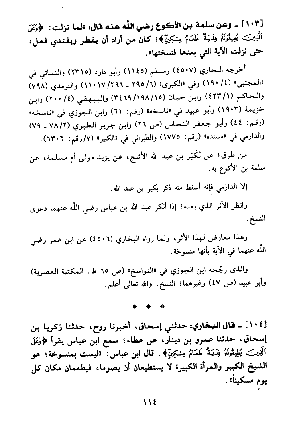 104 - قال البخاري: حدثني إسحاق، أخبرنا روح، حدثنا زكريا بن إسحاق، حدثنا عمرو بن دينار، عن عطاء؛ سمع ابن عباس يقرأ {وَعَلَى الَّذِينَ يُطِيقُونَهُ فِدْيَةٌ طَعَامُ مِسْكِينٍ}. قال ابن عباس: "ليست بمنسوخة؛ هو الشيخ الكبير والمرأة الكبيرة لا يستطيعان أن يصوما، فيطعمان مكان كل يومٍ مسكينًا".