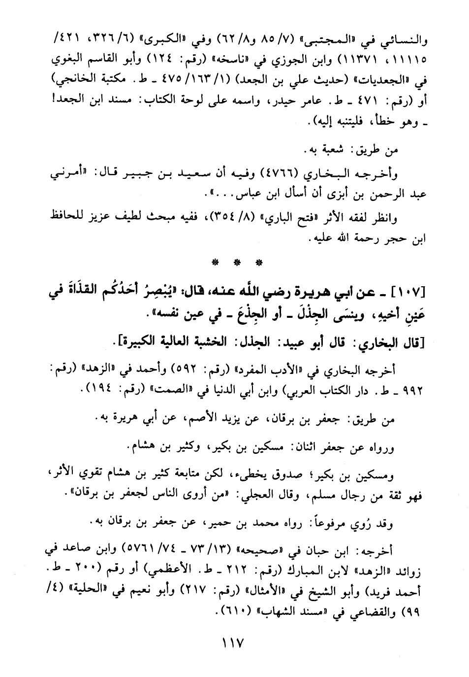 107 - عن أبي هريرة - رضي الله عنه -، قال: "يُبصِرُ أحَدُكُم القذَاةَ في عَيْنِ أخيهِ، وينسَى الجِذْلَ -أو الجِذْعَ- في عين نفسه".