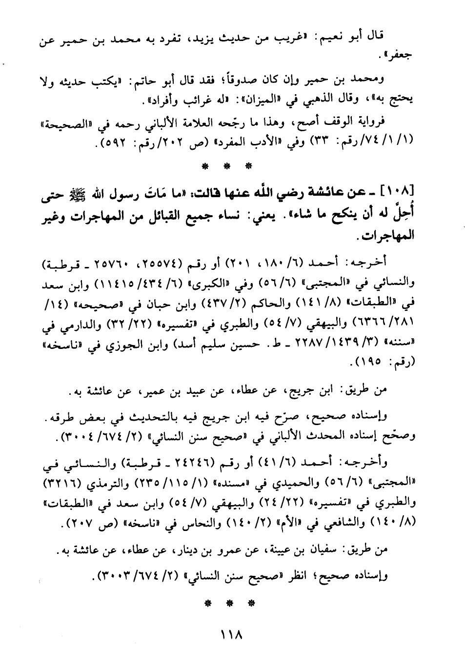 108 - عن عائشة - رضي الله عنها - قالت: "ما مَاتَ رسول الله - صلى الله عليه وسلم - حتى أُحِلَّ له أن ينكح ما شاء". يعني: نساء جميع القبائل من المهاجرات وغير المهاجرات.