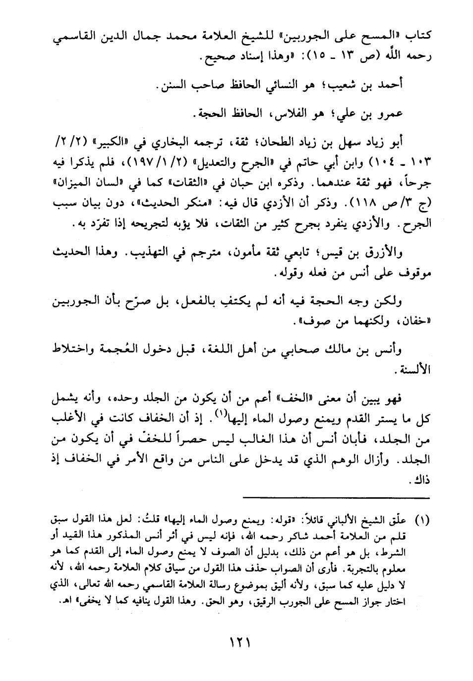 (¬1) علّق الشيخ الألباني قائلًا: "قوله: ويمنع وصول الماء إليها" قلتُ: لعل هذا القول سبق قلم من العلامة أحمد شاكر -رَحِمَهُ اللهُ-، فإنه ليس في أثر أنس المذكور هذا القيد أو الشرط، بل هو أعم من ذلك، بدليل أن الصوف لا يمنع وصول الماء إلى القدم كما هو معلوم بالتجربة. فأرى أن الصواب حذف هذا القول من سياق كلام العلامة -رَحِمَهُ اللهُ-، لأنه لا دليل عليه كما سبق، ولأنه أليق بموضوع رسالة العلامة القاسمي -رَحِمَهُ اللهُ تَعَالَى-، الذي اختار جواز المسح على الجورب الرقيق، وهو الحق. وهذا القول ينافيه مما لا يخفى" اهـ.