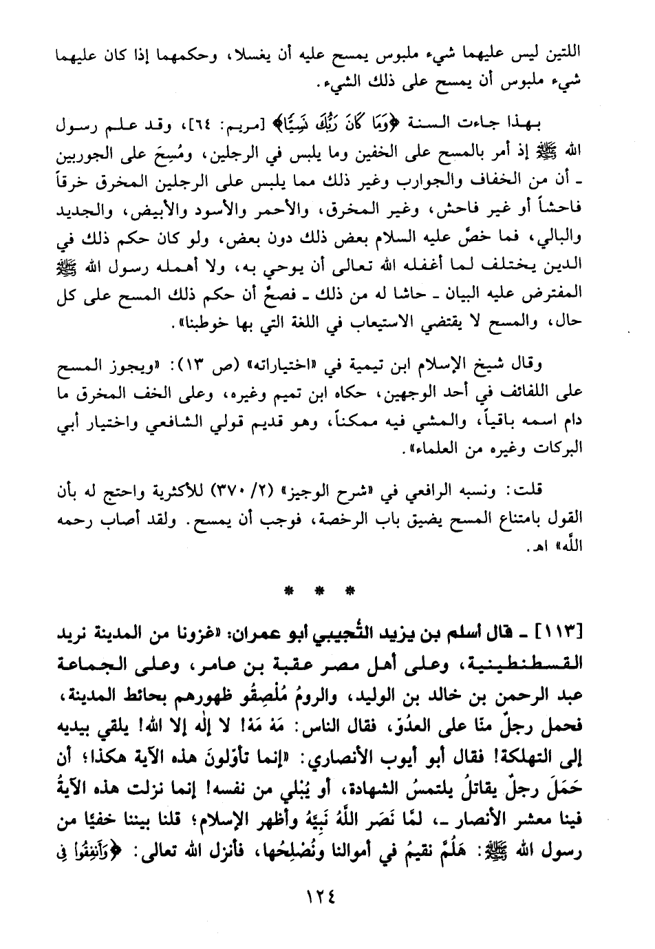 113 - قال أسلم بن يزيد التُّجيبي أبو عمران: "غزونا من المدينة نريد القسطنطينية، وعلى أهل مصر عقبة بن عامر، وعلى الجماعة عبد الرحمن بن خالد بن الوليد، والرومُ مُلْصِقُو ظهورهم بحائط المدينة، فحمل رجلٌ منا على العدُوّ، فقال الناس: مَهْ مَهْ! لا اله الا الله! يلقي بيديه إلى التهلكة! فقال أبو أيوب الأنصاري: "إنما تأوّلونَ هده الآية هكذا؛ أن حَمَلَ رجلٌ يقاتلُ يلتمسُ الشهادة، أو يُبْلي من نفسه! إنما نزلت هذه الآيةُ فينا معشر الأنصار-، لمَّا نَصَر اللهُ نَبيَّهُ وأظهر الإسلام؛ قلنا بيننا خفيًّا من رسول الله - صلى الله عليه وسلم -: هَلُمَّ نقيمٌ في أموالنا وَنُصْلِحُها، فأنزل الله تعالى: {وَأَنْفِقُوا فِي