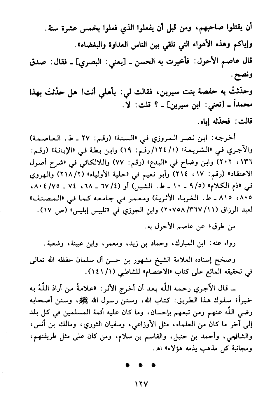 أخرجه: ابن نصر المروزي في "السنة" (رقم: 27 - ط. العاصمة) والآجري في "الشريعة" (1/ 124/ رقم: 19) وابن بطة في "الإبانة" (رقم: 136، 202) وابن وضاح في "البدع" (رقم: 77) واللالكائي في "شرح أصول الإعتقاد" (رقم: 17، 214) وأبو نعيم في "حلية الأولياء" (2/ 218) والهروي في "ذم الكلام" (5/ 9 - 10 - ط. الشبل) أو (4/ 67 - 68، 74 - 75/ 804، 805، 815 - ط. الغرباء الأثرية) ومعمر في جامعه كما في "المصنف" لعبد الرزاق (11/ 367/ 20758) وابن الجوزي في "تلبيس إبليس" (ص 17).