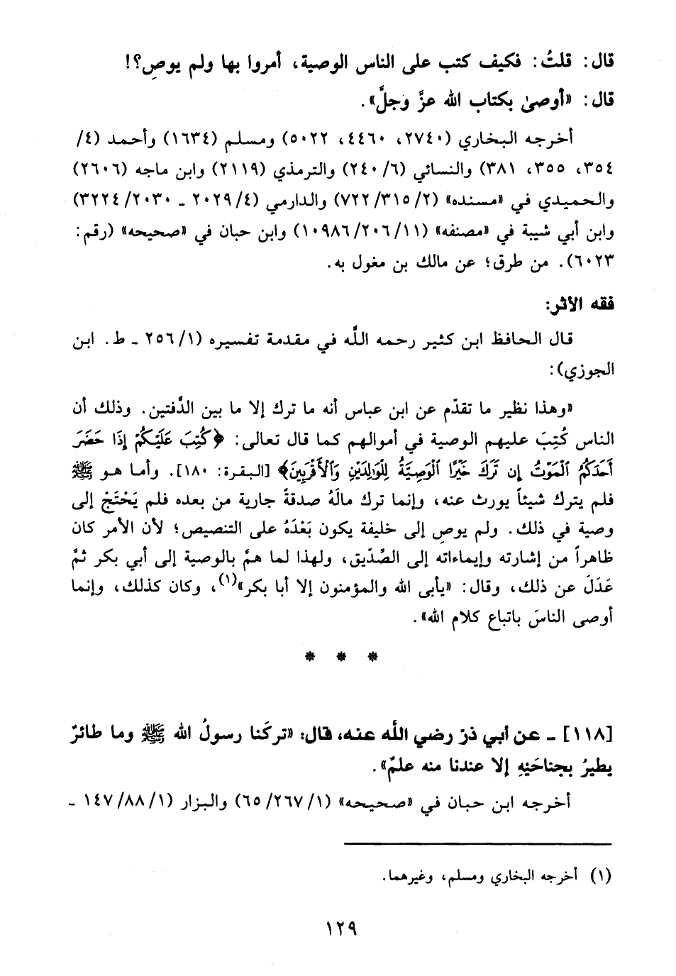 118 - عن أبي ذرّ - رضي الله عنه -، قال: "تركَنا رسولُ الله - صلى الله عليه وسلم - وما طائرٌ يطيرُ بجناحَيْهِ إلا عندنا منه علمٌ".