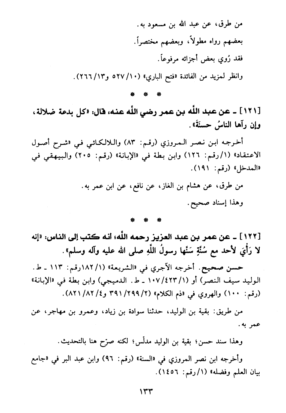 121 - عن عبد الله بن عمر - رضي الله عنه -، قال: "كل بدعة ضلالة، وإن رآها الناسُ حسنَةَ".