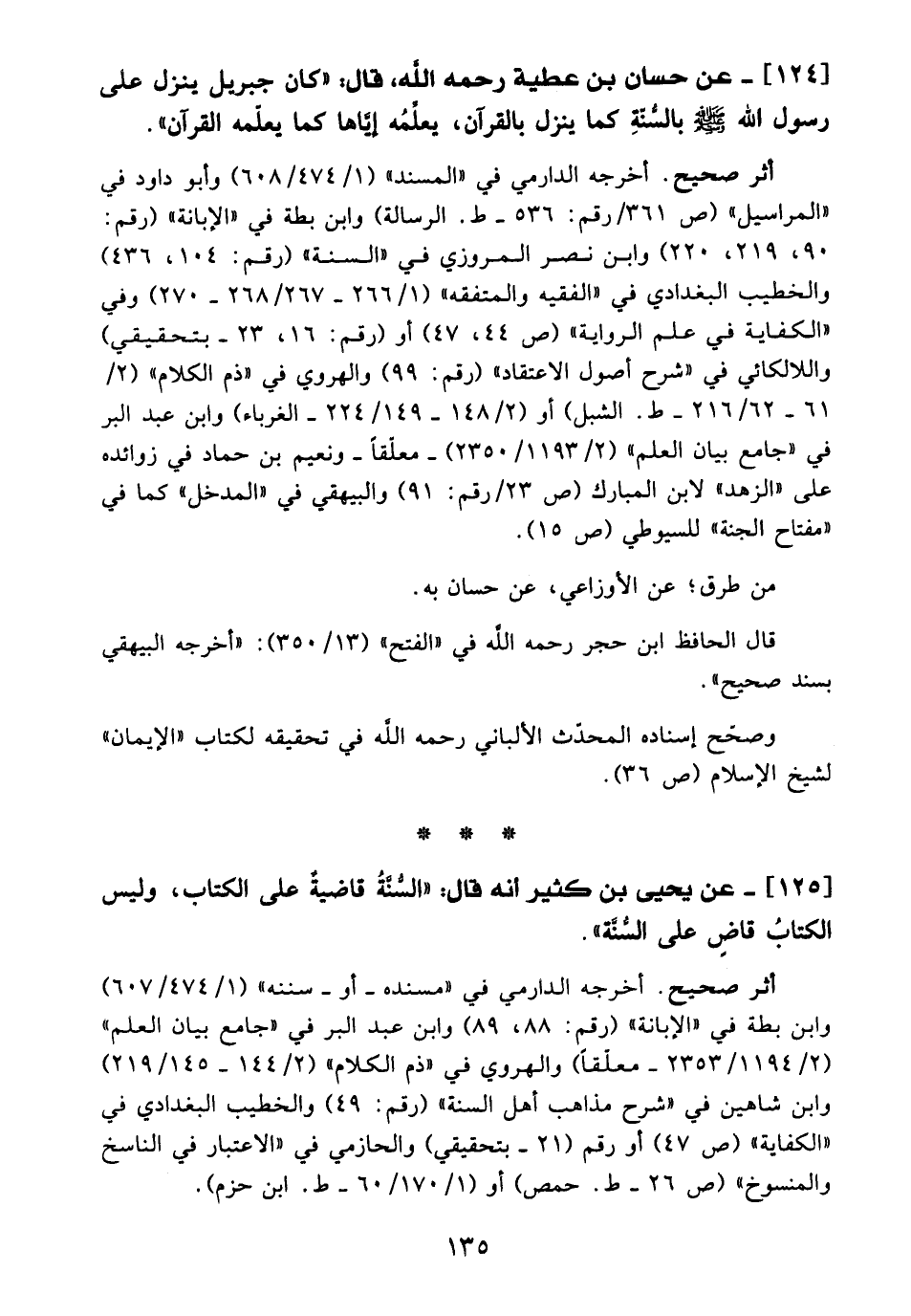 125 - عن يحيى بن كثير أنه قال: "السُّنّةُ قاضيةٌ على الكتاب، وليس الكتابُ قاضٍ على السُّنَّة".