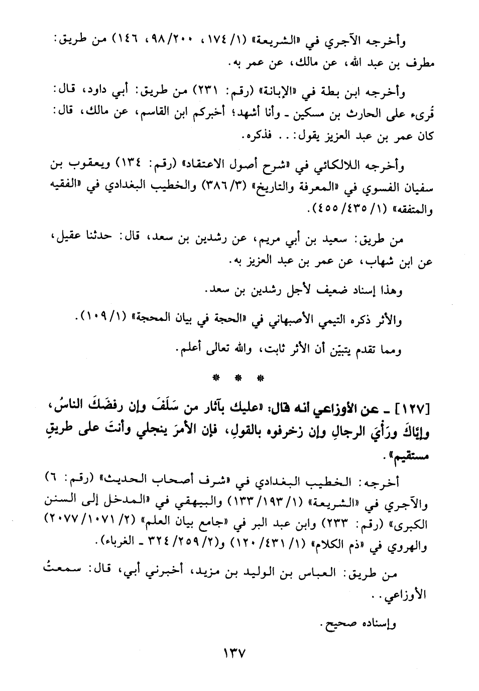 وأخرجه الآجري في "الشريعة" (1/ 174، 200/ 98، 146) من طريق: مطرف بن عبد الله، عن مالك، عن عمر به.