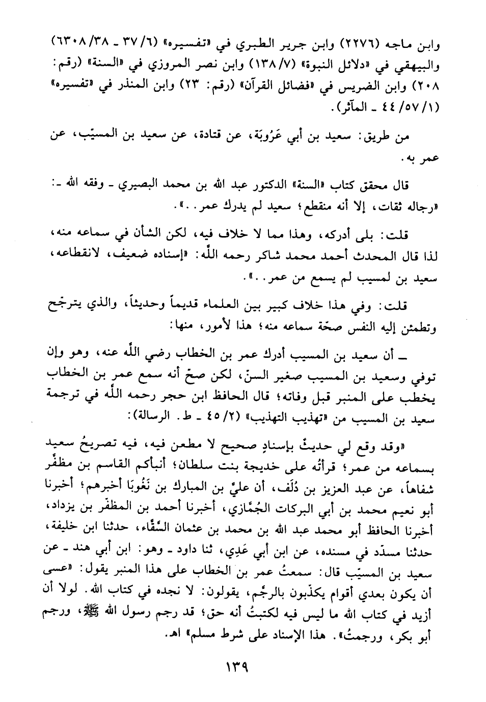 "وقد وقع لي حديثٌ بإسناد صحيح لا مطعن فيه، فيه تصريحُ سعيد بسماعه من عمر؛ قرأتُه على خديجة بنت سلطان؛ أنبأكم القاسم بن مظفَّر شفاهًا، عن عبد العزيز بن دُلَف، أن عليَّ بن المبارك بن نَغُوبَا أخبرهم؛ أخبرنا أبو نعيم محمد بن أبي البركات الجُمَّازي، أخبرنا أحمد بن المظفّر بن يزداد، أخبرنا الحافظ أبو محمد عبد الله بن محمد بن عثمان السَّقَّاء، حدثنا ابن خليفة، حدثنا مسدّد في مسنده، عن ابن أبي عَدِي، ثنا داود -وهو: ابن أبي هند- عن سعيد بن المسيّب قال: سمعتُ عمر بن الخطاب على هذا المنبر يقول: "عسى أن يكون بعدي أقوام يكذبون بالرجَّم، يقولون: لا نجده في كتاب الله. لولا أن أزيد في كتاب الله ما ليس فيه لكتبت أنه حق؛ قد رجم رسول الله - صلى الله عليه وسلم -، ورجم أبو بكر، ورجمتُ". هذا الإسناد على شرط مسلم" اهـ.