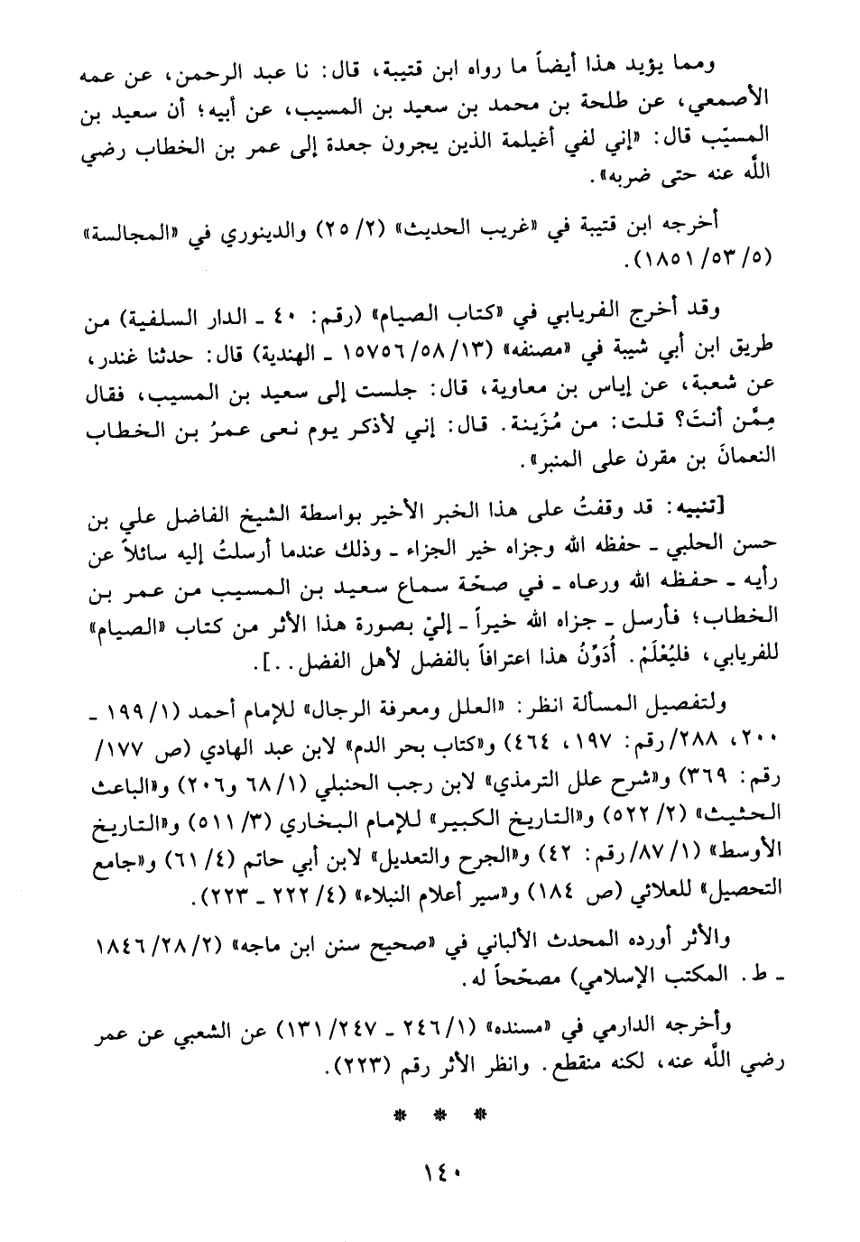[تنبيه: قد وقفتُ على هذا الخبر الأخير بواسطة الشيخ الفاضل علي بن حسن الحلبي -حفظه الله وجزاه خير الجزاء- وذلك عندما أرسلتُ إليه سائلًا عن رأيه -حفظه الله ورعاه- فى صحّة سماع سعيد بن المسيب من عمر بن الخطاب؛ فأرسل -جزاه الله خيرًا- إليّ بصورة هذا الأثر من كتاب "الصيام" للفريابي، فليُعْلَمْ. أُدَوِّنُ هذا اعترافًا بالفضل لأهل الفضل ..].