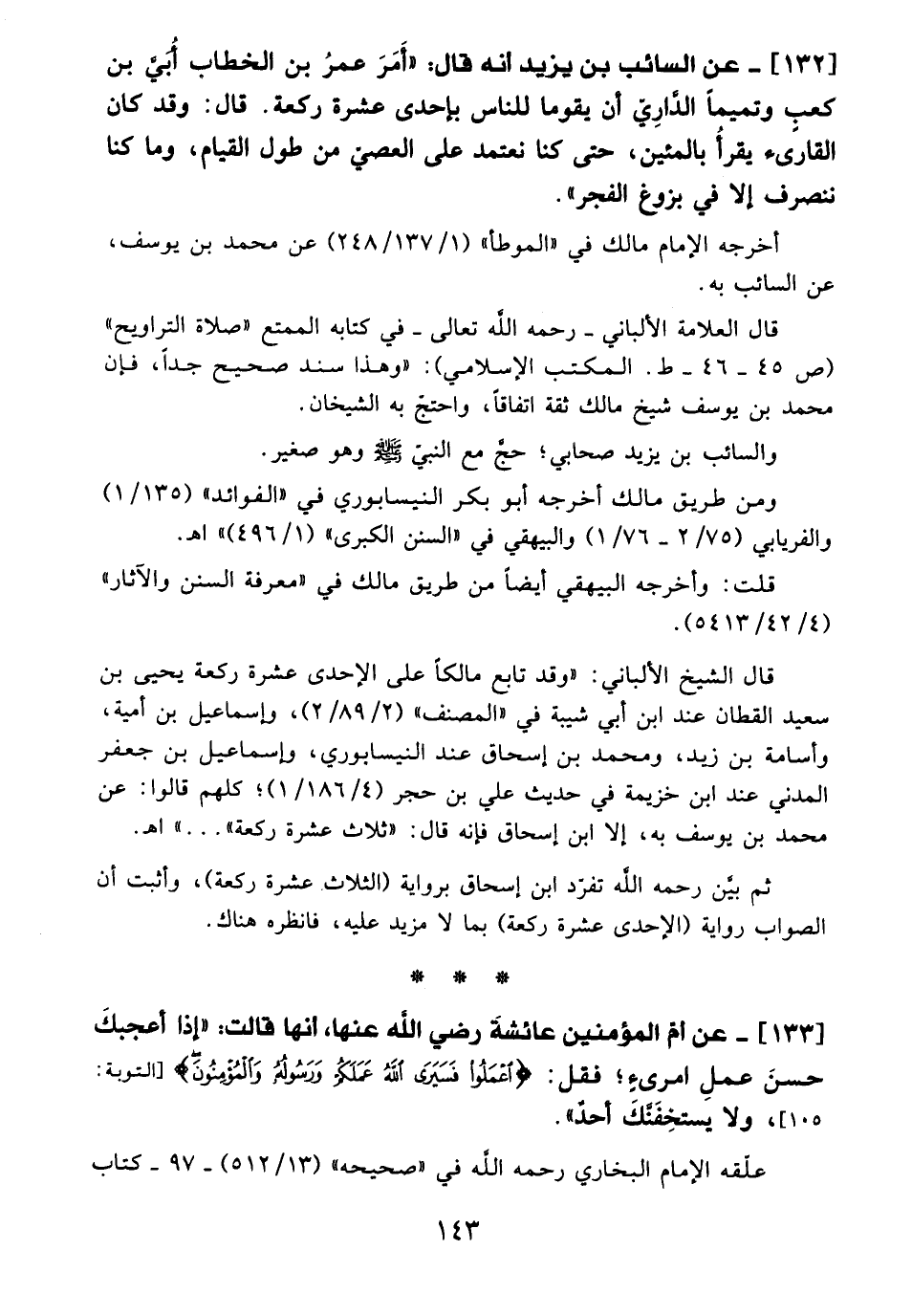 132 - عن السائب بن يزيد أنه قال: "أَمَرَ عمرُ بن الخطاب أُبَيَّ بن كعبِ وتميمًا الدَّارِيّ أن يقوما للناس بإحدى عشرة ركعة. قال: وقد كان القارئ يقرأ بالمئين، حتى كلنا نعتمد على العصيّ من طول القيام، وما كنا ننصرف إلا في بزوغ الفجر".