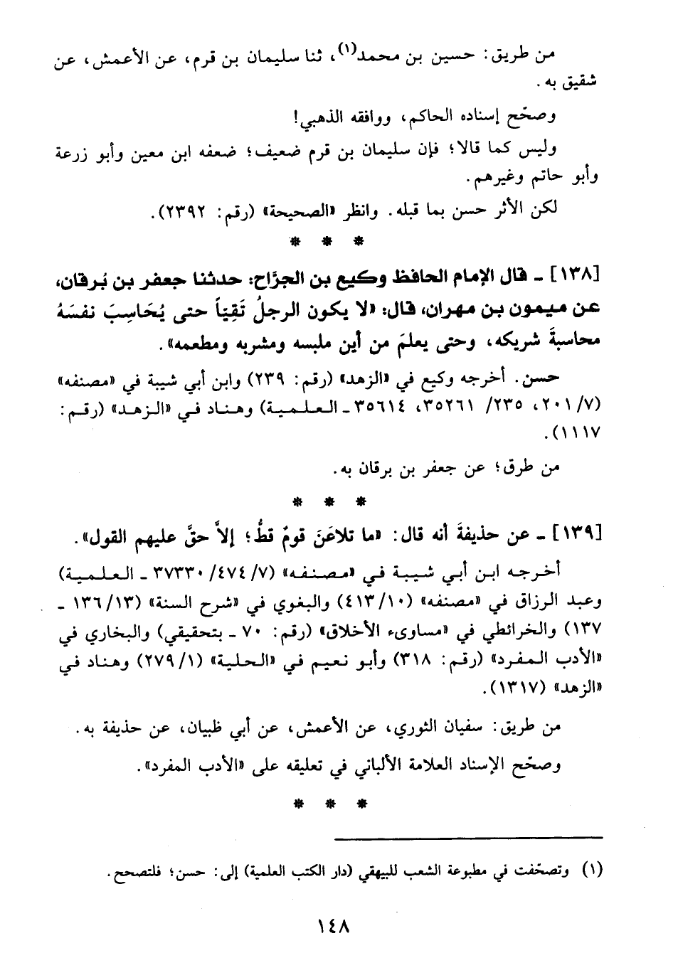 138 - قال الإمام الحافظ وكيع بن الجرَّاح: حدثنا جعفر بن بُرقان، عن ميمون بن مهران، قال: "لا بكون الرجلُ تَقِيًّا حتى يُحَاسِبَ نفسَهُ محاسبةَ شريكه، وحتى يعلمَ من أين ملبسه ومشربه ومطعمه".