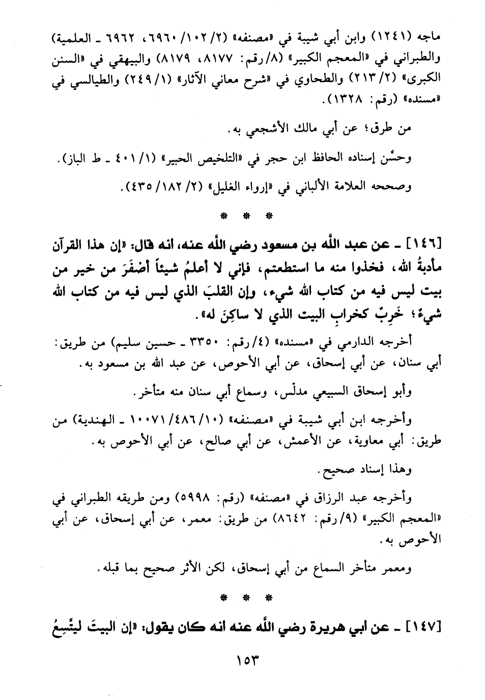 146 - عن عبد الله بن مسعود - رضي الله عنه -، أنه قال: "إن هذا القرآن مأدبةُ الله، فخذوا منه ما استطعتم، فإني لا أعلمُ شيئًا أصْفَرَ من خير من بيت ليس فيه من كتاب الله شيء، وإن القلبَ الذي ليس فيه من كتاب الله شيءٌ؛ خَرِبٌ كخرابِ البيت الدي لا ساكِنَ له".