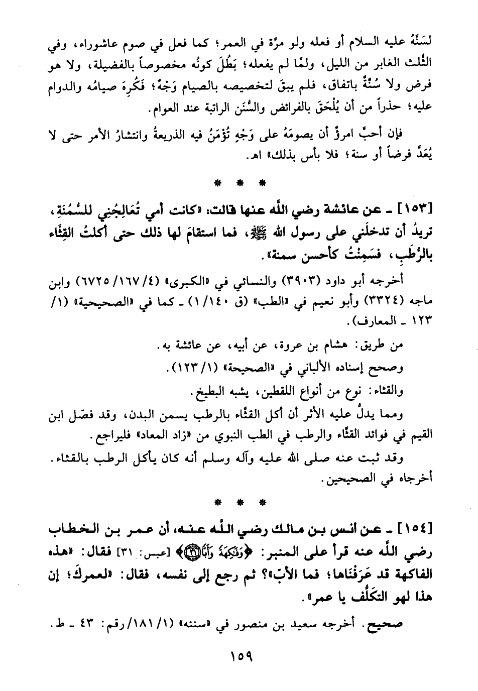 153 - عن عائشة - رضي الله عنها - قالت: "كانت أمي تُعَالِجُنِي للسُّمُنَةِ، نريدُ أن تدخلَني على رسول الله - صلى الله عليه وسلم -، فما استقامَ لها ذلك حتى أكلتُ القِثَّاء بالرُّطَبِ، فسَمِنْتُ كأَحسن سمنة".