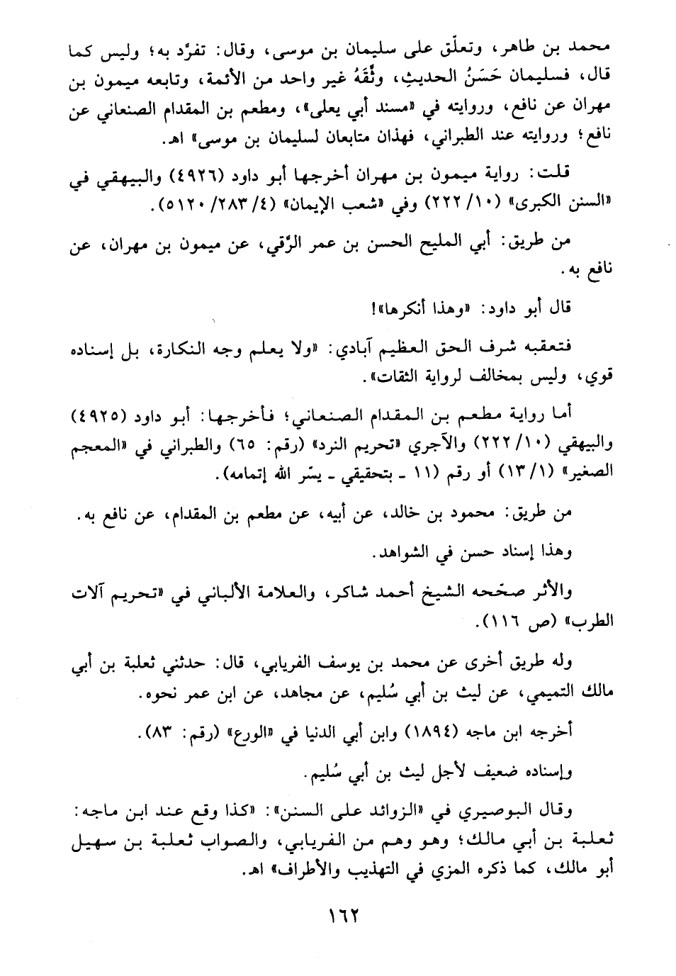محمد بن طاهر، وتعلّق على سليمان بن موسى، وقال: تفرَّد به؛ وليس كما قال، فسليمان حَسَنُ الحديثِ، وثَّقَهُ غير واحد من الأئمة، وتابعه ميمون بن مهران عن نافع، وروايته في "مسند أبى يعلى"، ومطعم بن المقدام الصنعاني عن نافع؛ وروايته عند الطبراني، فهذان متابعان لسليمان بن موسى" اهـ.