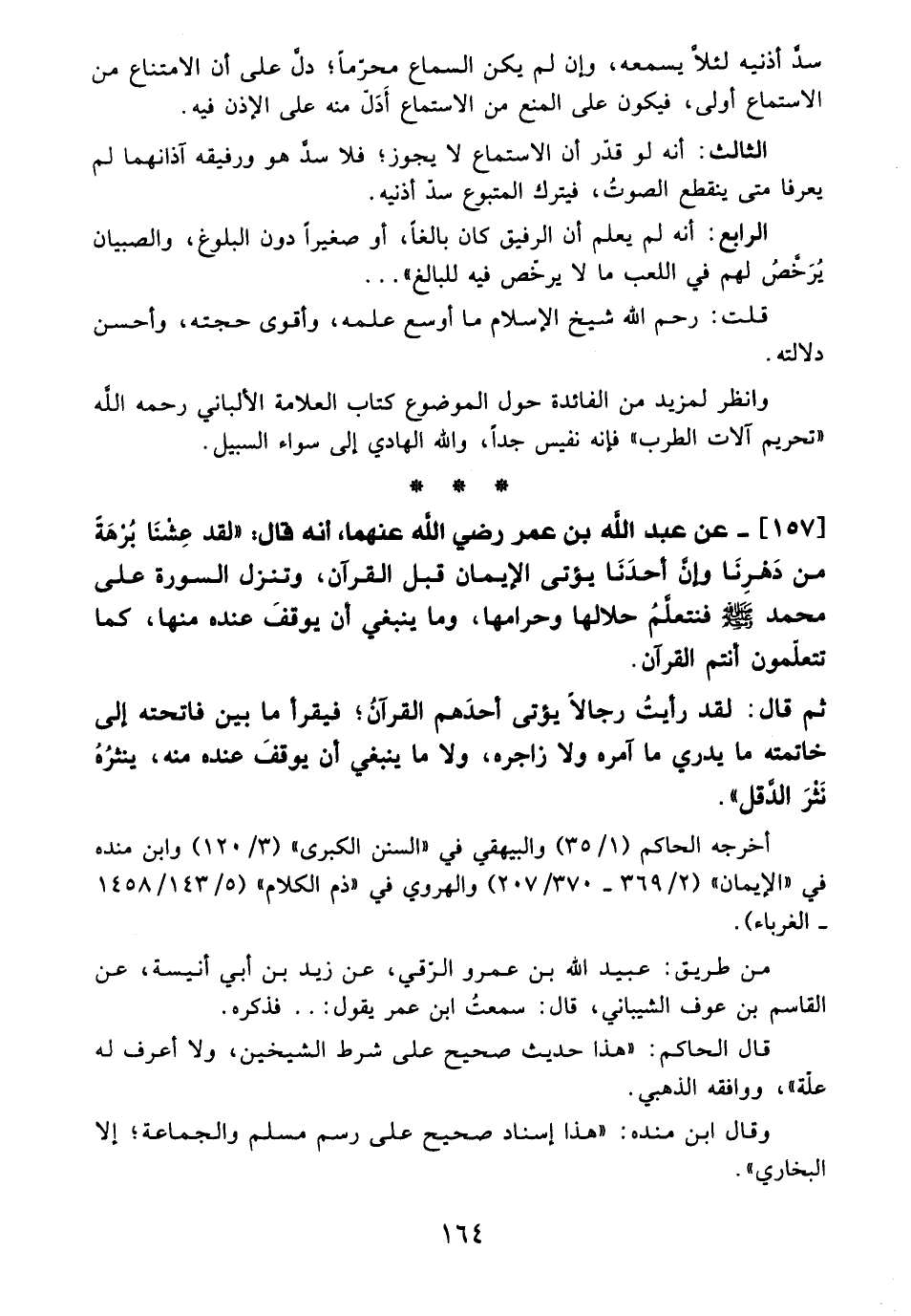 157 - عن عبد الله بن عمر - رضي الله عنهما -، أنه قال: "لقد عِشْنَا بُرْهَةً من دَهْرِنَا وإن أحدَنَا يؤتى الإيمان قبل القرآن، وتنزل السورة على محمد - صلى الله عليه وسلم - فنتعلمُ حلالها وحرامها، وما ينبغي أن يوقفَ عنده منها، كما تتعلّمون أنتم القرآن.
