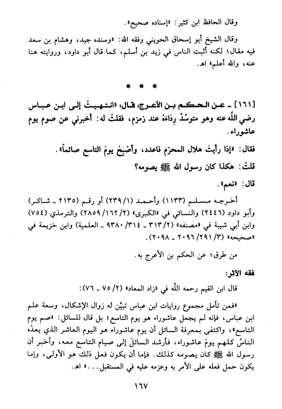 161 - عن الحكم بن الأعرج، قال: "انتهيتُ إلى ابن عباس - رضي الله عنه - وهو متوسِّدٌ رِدَاءَهُ عند زمزم، فقلتُ له: أخبرني عن صوم يوم عاشوراء.