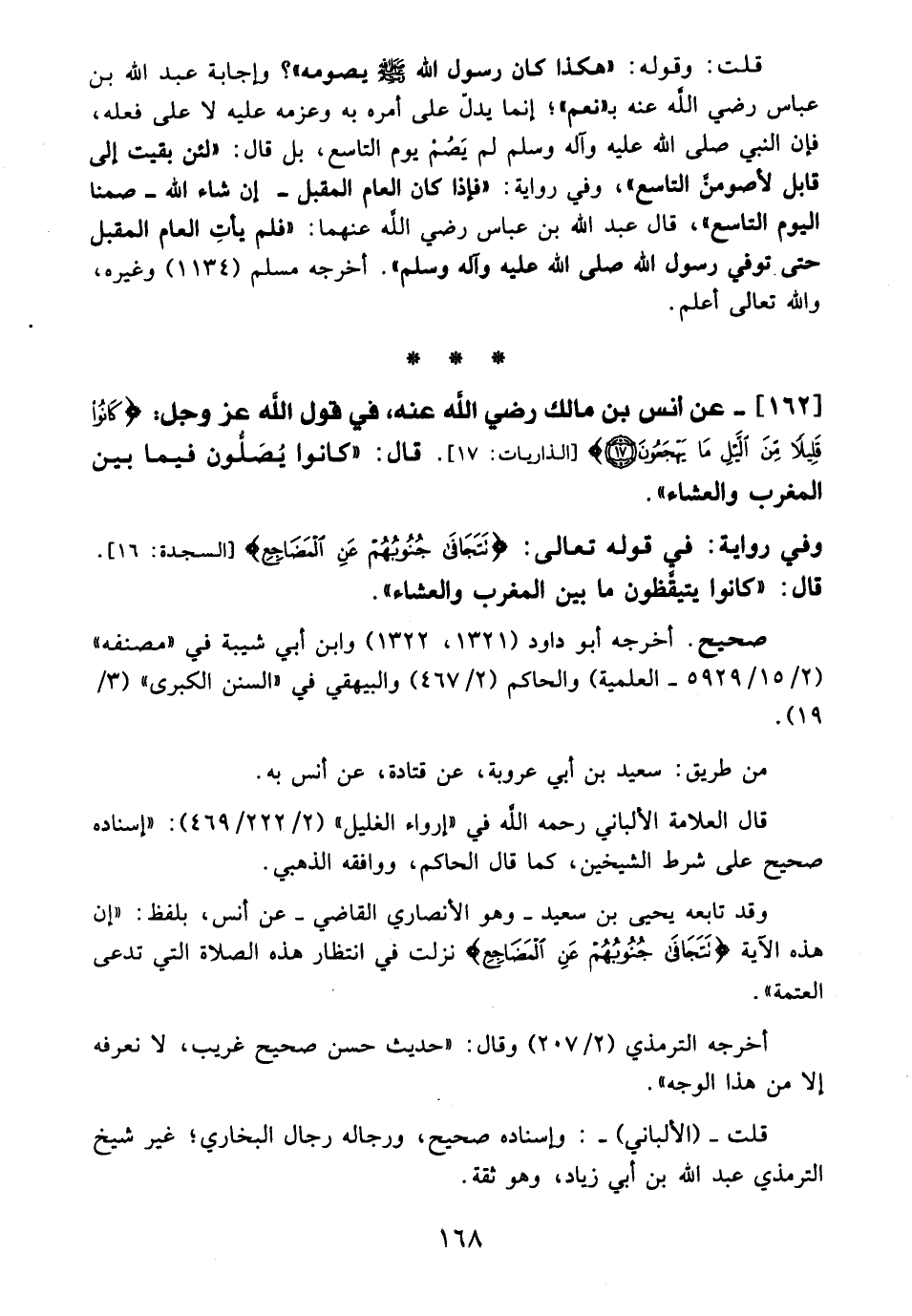 162 - عن أنس بن مالك - رضي الله عنه -، في قول الله -عَزَّ وَجَلَّ-: {كَانُوا قَلِيلًا مِنَ اللَّيْلِ مَا يَهْجَعُونَ (17)} [الذاريات: 17]. قال: "كانوا يُصَلُّون فيما بين المغرب والعشاء".