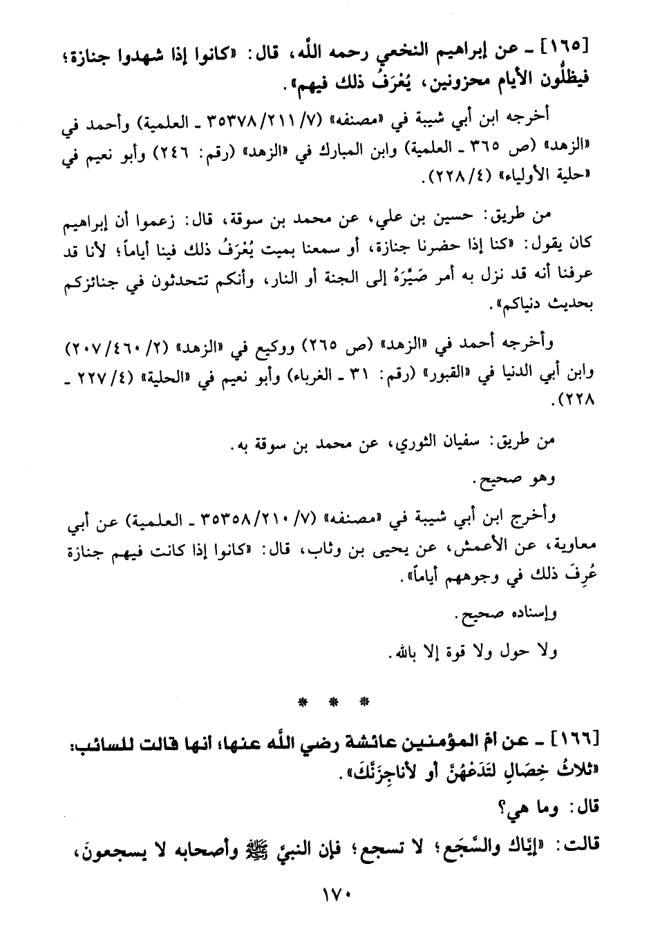 165 - عن ابراهيم النخعي -رَحِمَهُ اللهُ-، قال: "كانوا إذا شهدوا جنازة؛ فيظلُّون الأيام محزونين، يُعْرَفُ ذلك فيهم".