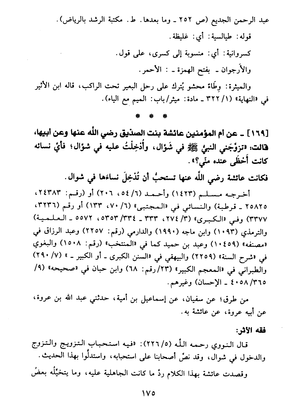 169 - عن أم المؤمنين عائشة بنت الصدّيق - رضي الله عنها - وعن أبيها، قالت: "تزوَّجَني النبيُّ - صلى الله عليه وسلم - في شَوَّال، وأُدْخِلْتُ عليه في شوَّال؛ فأيَّ نسائه كانت أَحْظَى عنده منّي؟ ".