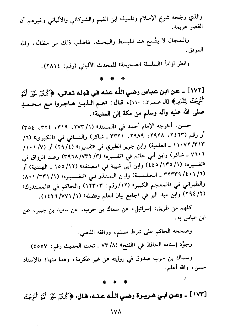 172 - عن ابن عباس - رضي الله عنه - في قوله تعالى: {كُنْتُمْ خَيْرَ أُمَّةٍ أُخْرِجَتْ لِلنَّاسِ} [آل عمران: 110]، قال: "هم الذين هاجروا مع محمدٍ - صلى الله عليه وآله وسلم - من مكة إلى المدينة".