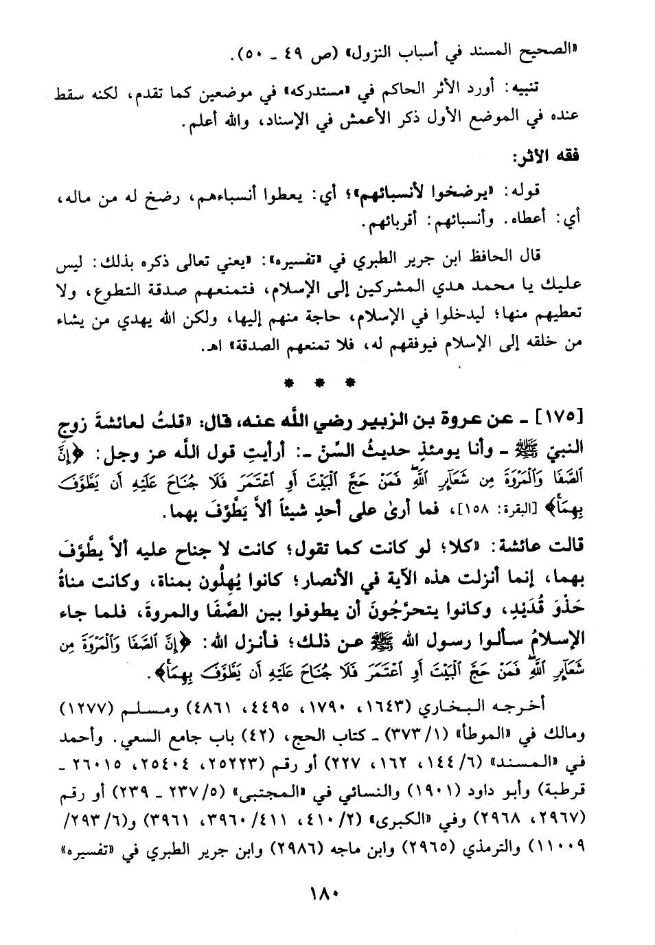 175 - عن عروة بن الزبير - رضي الله عنه -، قال: "قلتُ لعائشةَ زوج النبي - صلى الله عليه وسلم - وأنا يومئذٍ حديثُ السِّنّ-: أرأيتِ قول الله -عَزَّ وَجَلَّ-: {إِنَّ الصَّفَا وَالْمَرْوَةَ مِنْ شَعَائِرِ اللَّهِ فَمَنْ حَجَّ الْبَيْتَ أَوِ اعْتَمَرَ فَلَا جُنَاحَ عَلَيْهِ أَنْ يَطَّوَّفَ بِهِمَا} [البقرة: 158]، فما أرى على أحدٍ شيئًا ألَّا يَطَّوَّفَ بهما.