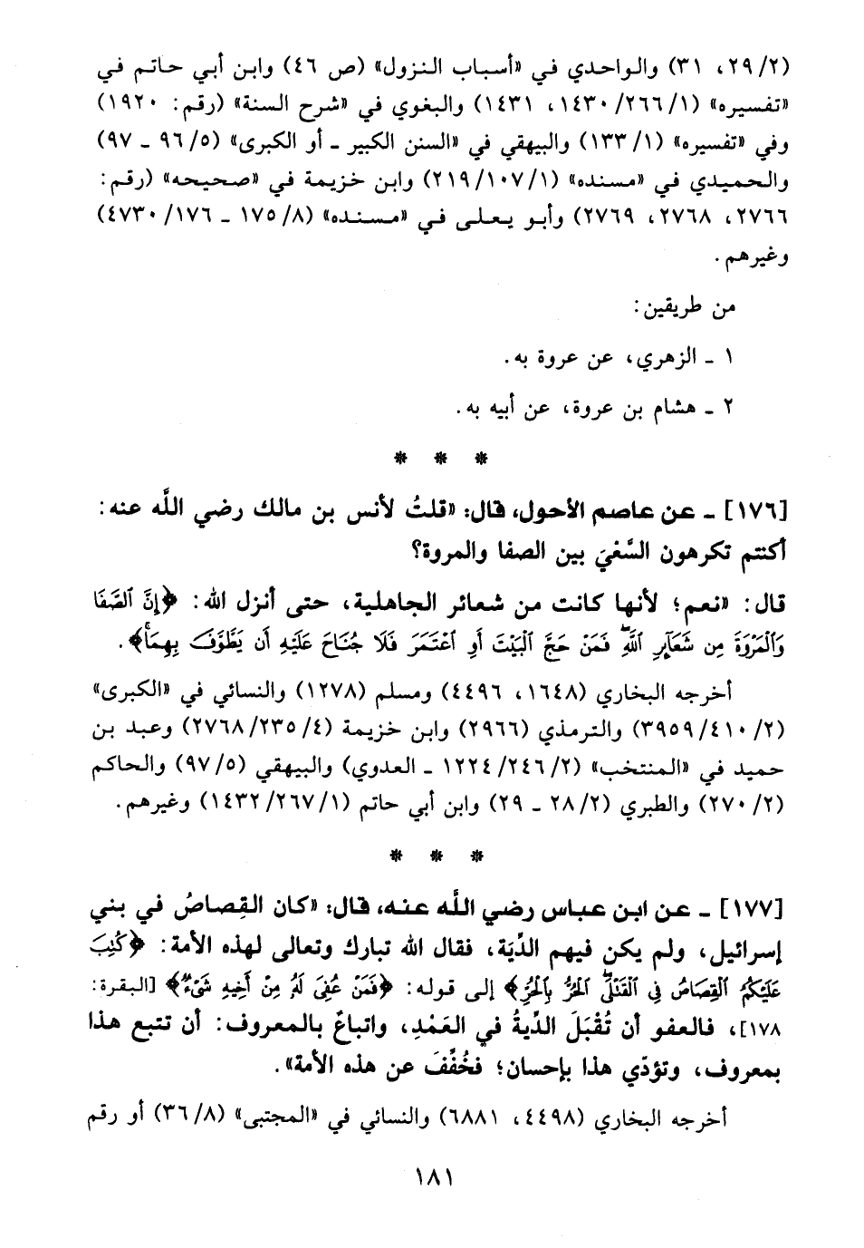 176 - عن عاصم الأحول، قال: "قلتُ لأنس بن مالك - رضي الله عنه -: كتم تكرهون السَّعْيَ بين الصفا والمروة؟