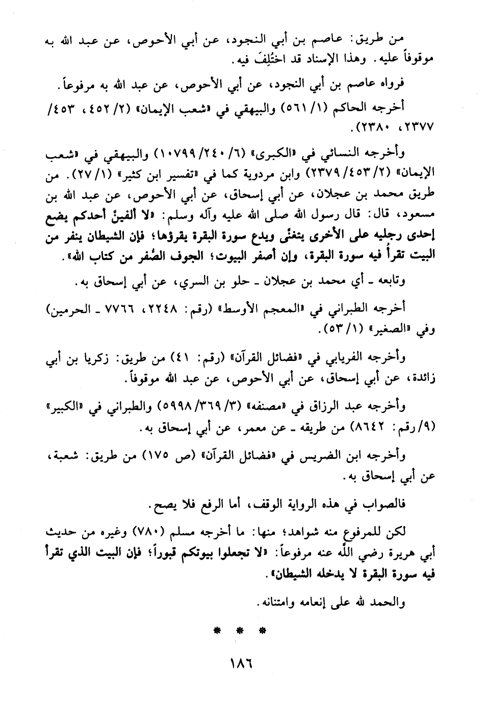 وأخرجه النسائي في "الكبرى" (6/ 240/ 10799) والبيهقي في "شعب الإيمان" (2/ 453/ 2379) وابن مردوية كما في "تفسير ابن كثير" (1/ 27). من طريق محمد بن عجلان، عن أبي إسحاق، عن أبي الأحوص، عن عبد الله بن مسعود، قال: قال رسول الله - صلى الله عليه وآله وسلم -: "لا ألفينَّ أحدكم يضع إحدى رجليه على الأخرى يتغنى وباع سورة البقرة يقرؤها؛ فإن الشيطان ينفر من البيت تقرأُ فيه سورة البقرة، وإن أصفر البيوت؛ الجوف الصُّفر من كتاب الله".