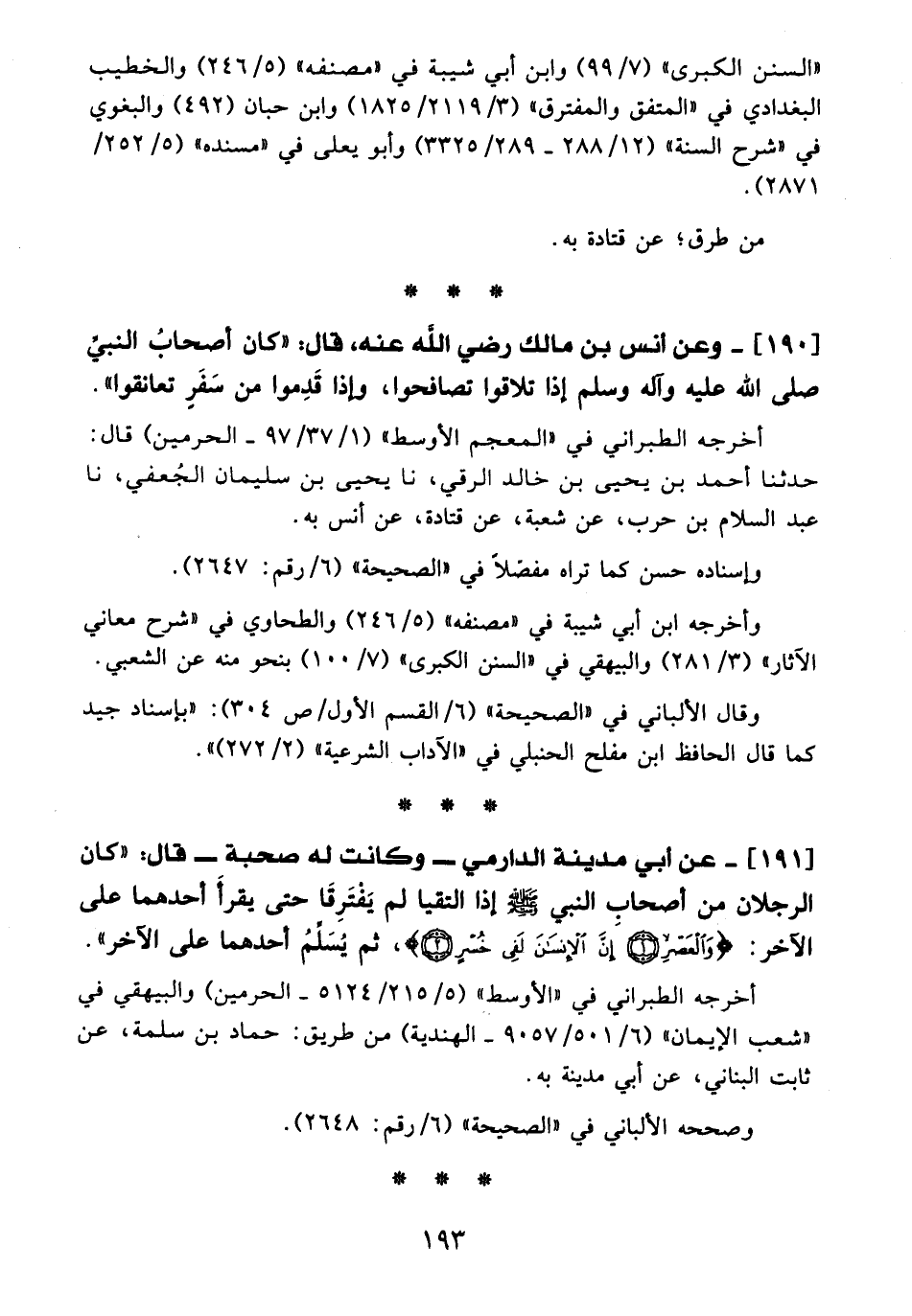 191 - عن أبي مدينة الدارمي -وكانت له صحبة- قال: "كان الرجلان من أصحاب النبي - صلى الله عليه وسلم - إذا التقيا لم يَفْتَرِقَا حتى يقرأَ أحدهما على الآخر: {وَالْعَصْرِ (1) إِنَّ الْإِنْسَانَ لَفِي خُسْرٍ (2)}، ثم يُسَلِّمُ أحدهما على الآخر".