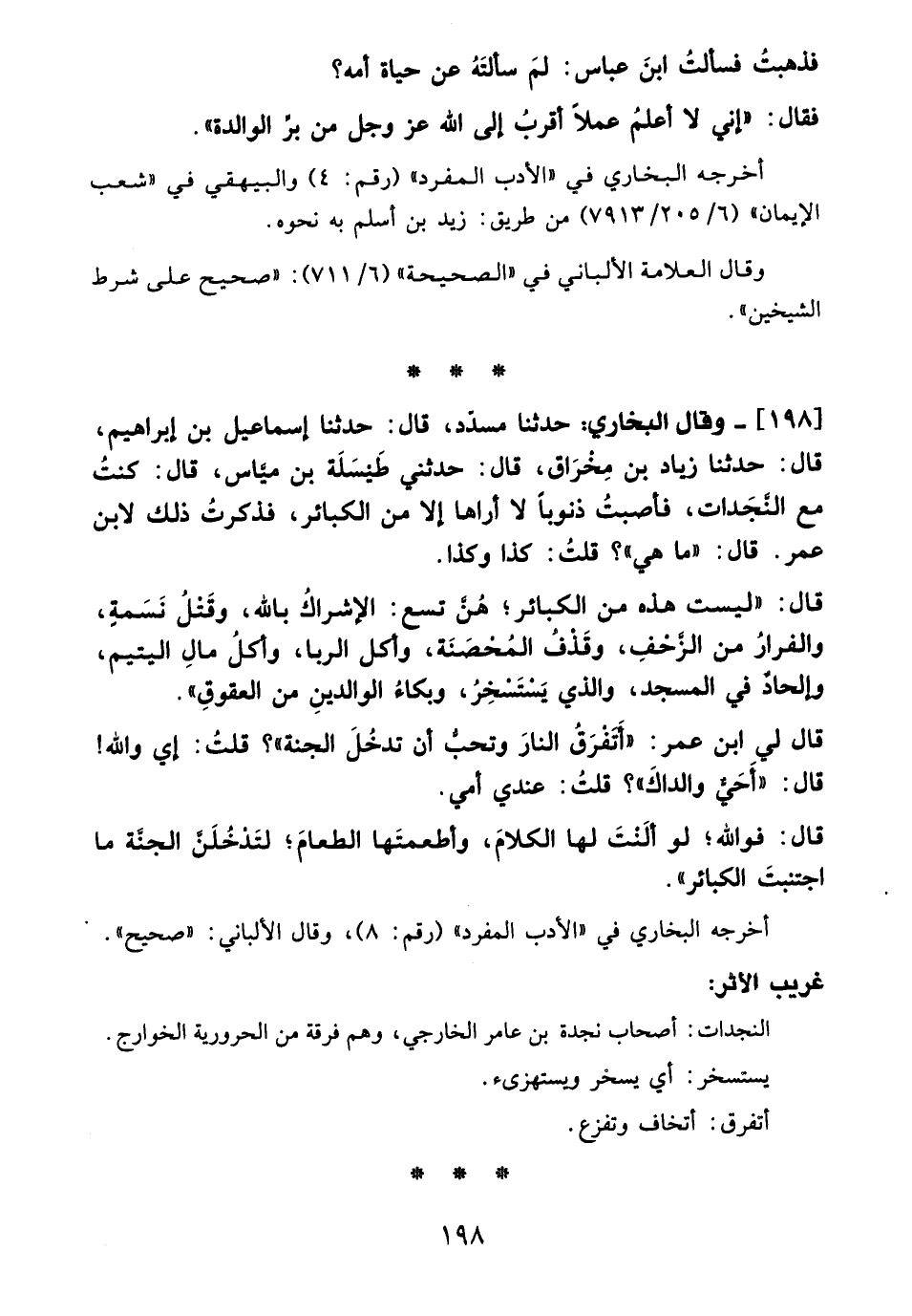 198 - وقال البخاري: حدثنا مسدّد، قال: حدثنا إسماعيل بن إبراهيم، قال: حدثنا زياد بن مِخرَاق، قال: حدثني طَيْسَلَة بن ميَّاس، قال: كنتُ مع النَّجَدات، فأصبتُ ذنوبًا لا أراها إلا من الكبائر، فذكرتُ ذلك لابن عمر. قال: "ما هي"؟ قلتُ: كذا وكذا.