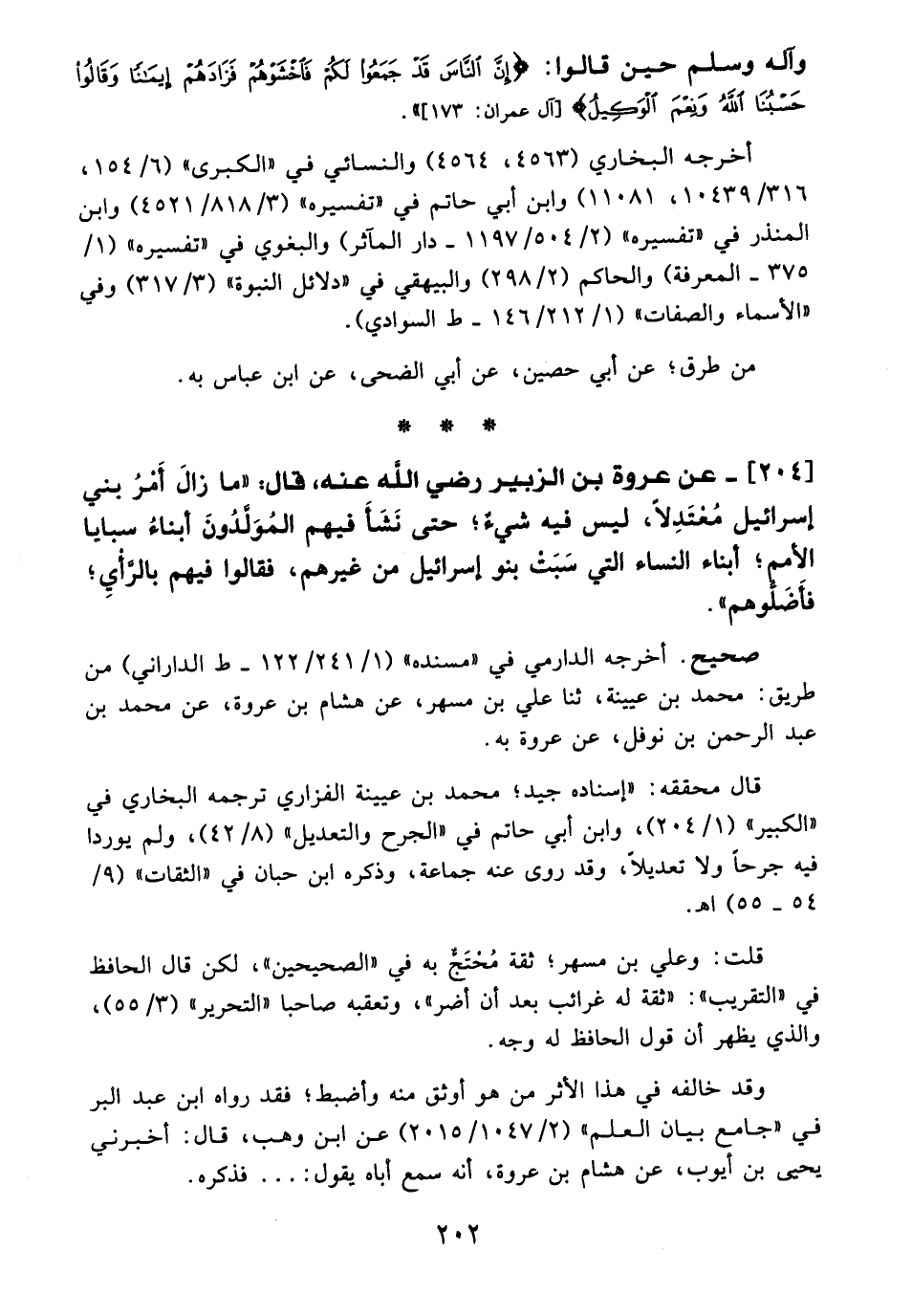 204 - عن عروة بن الزبير - رضي الله عنه -، قال: "ما زالَ أَمْرُ بني إسرائيل مُعتدِلًا، ليس فيه شيءٌ؛ حتى نَشَأَ فيهم المُوَلَّدُونَ أبناءُ سبايا الأمم؛ أبناء النساء التي سَبَتْ بنو إسرائيل من غيرهم، فقالوا فيهم بالرَّأْيِ؛ فأَضَلُّوهم".