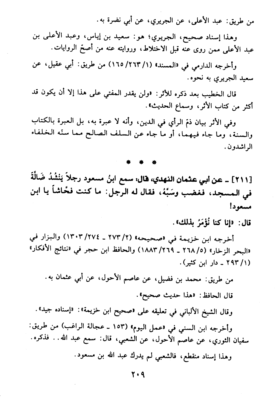 211 - عن أبي عثمان النهدي، قال: سمع ابن مسعود رجلًا ينشدُ ضَالَّة في المسجد، فغضب وسَبَّهُ، فقال له الرجل: ما كنت فحَّاشًا يا ابن مسعود!