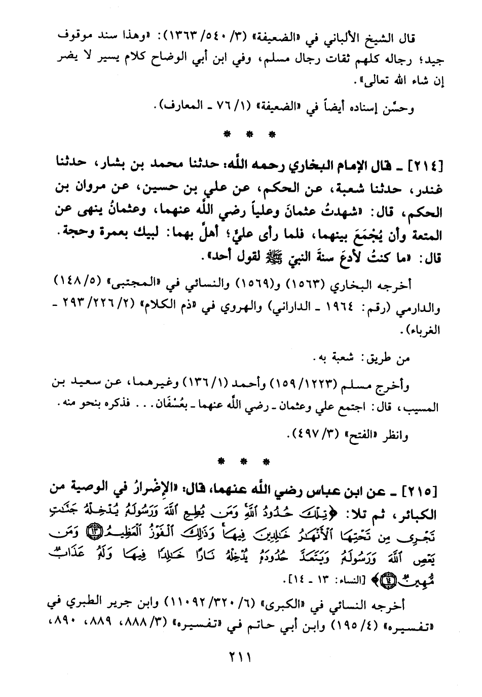 214 - قال الإمام البخاري -رَحِمَهُ اللهُ-: حدثنا محمد بن بشار، حدثنا غندر، حدثنا شعبة، عن الحكم، عن علي بن حسين، عن مروان بن الحكم، قال: "شهدتُ عثمانَ وعليًا - رضي الله عنهما -، وعثمانُ ينهى عن المتعة وأن يُجمَعَ بينهما، فلما رأى عليٌّ؛ أهلَّ بهما: لبيك بعمرة وحجة. قال: "ما كنتُ لأدعَ سنةَ النبيّ - صلى الله عليه وسلم - لقول أحد".