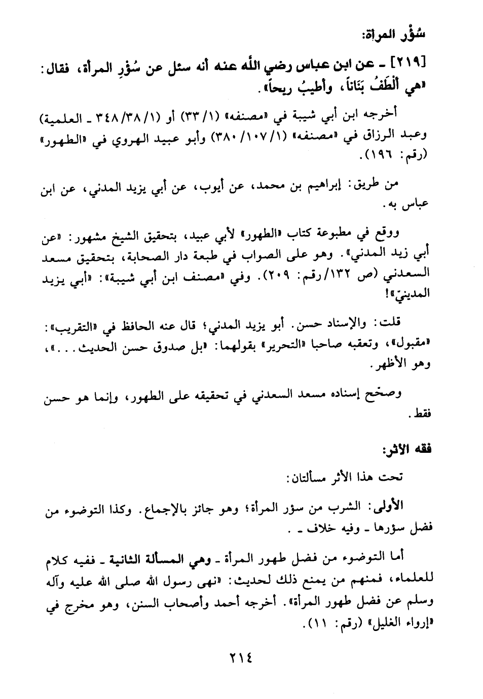 219 - عن ابن عباس - رضي الله عنه - أنه سئل عن سُؤْرِ المرأة، فقال: "هي ألطَفُ بَنَانًا، وأطيبُ ريحًا".