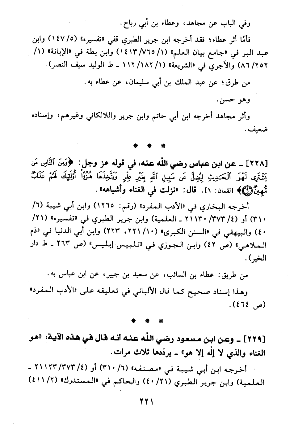 228 - عن ابن عباس - رضي الله عنه -، في قوله -عَزَّ وَجَلَّ-: {وَمِنَ النَّاسِ مَنْ يَشْتَرِي لَهْوَ الْحَدِيثِ لِيُضِلَّ عَنْ سَبِيلِ اللَّهِ بِغَيْرِ عِلْمٍ وَيَتَّخِذَهَا هُزُوًا أُولَئِكَ لَهُمْ عَذَابٌ مُهِينٌ} [لقمان: 6]. قال: "نزلت في الغناء وأشباهه".