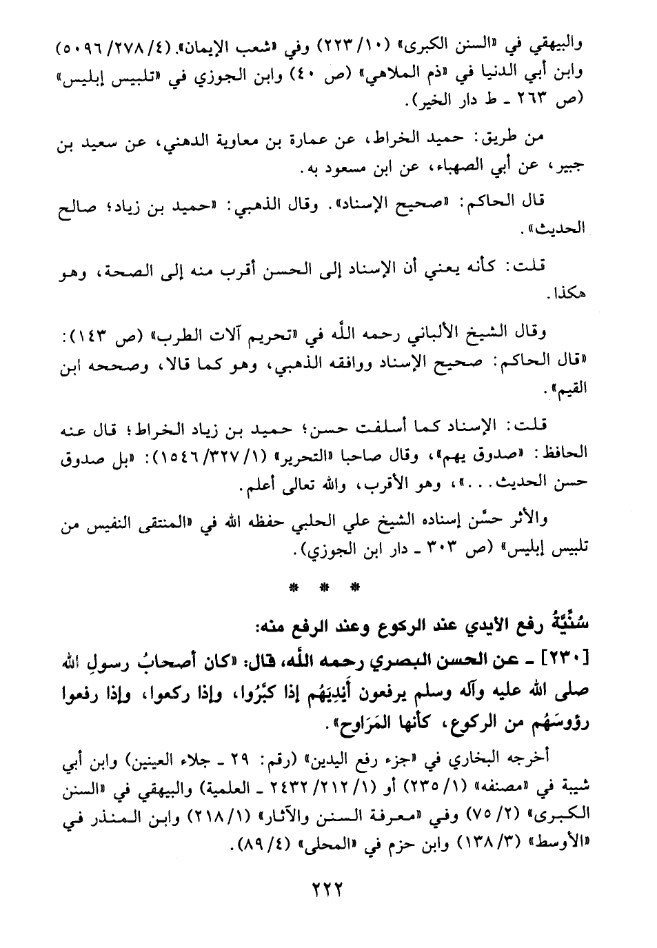 230 - عن الحسن البصري -رَحِمَهُ اللهُ-، قال: "كان أصحابُ رسولِ الله - صلى الله عليه وآله وسلم - يرفعون أَيدِيَهُم إذا كبَّرُوا، وإذا ركعوا، وإذا رفعوا رؤوسَهُم من الركوع، كأنها المَرَاوح".