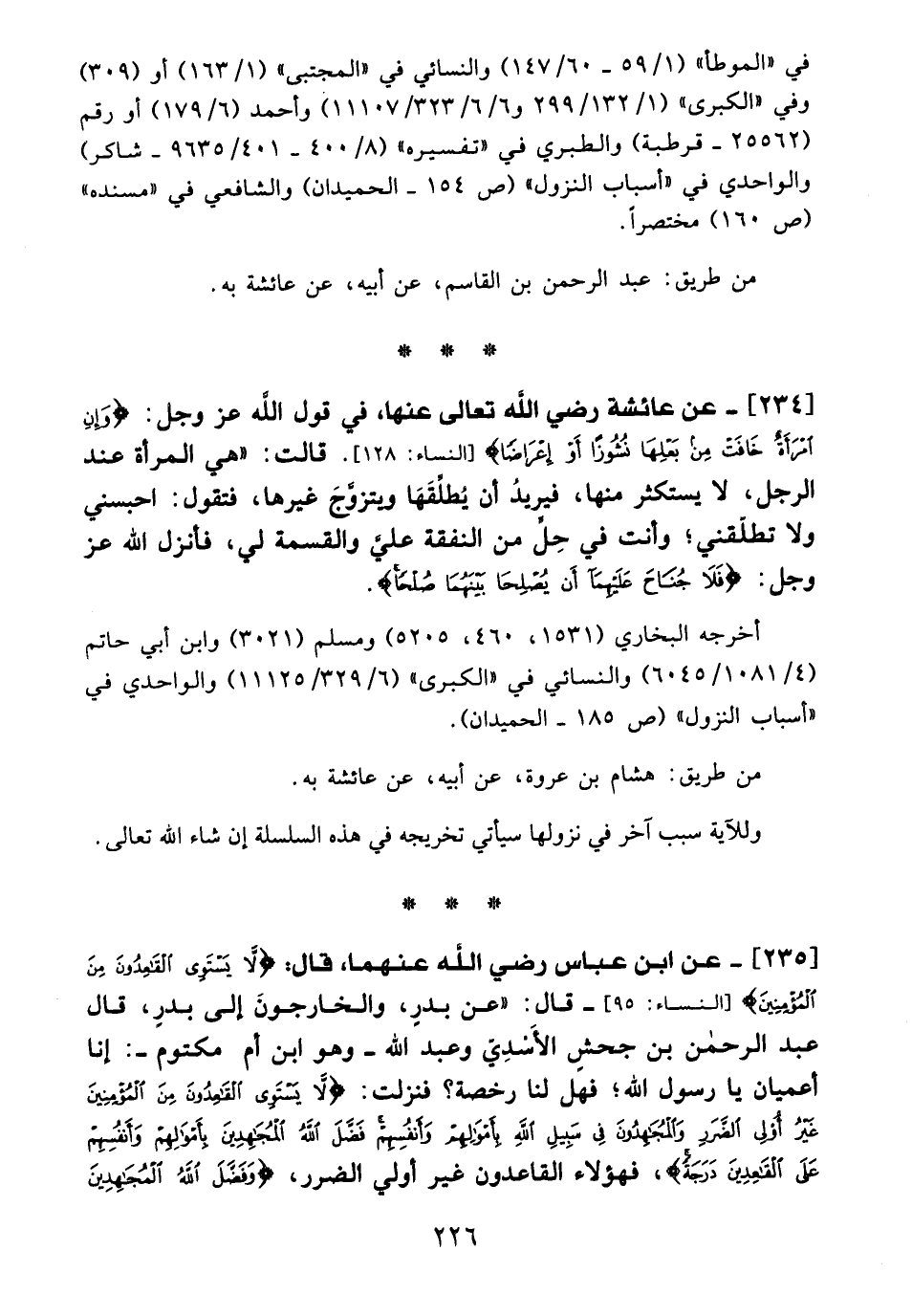 235 - عن ابن عباس - رضي الله عنهما -، قال، {لَا يَسْتَوِي الْقَاعِدُونَ مِنَ الْمُؤْمِنِينَ} [النساء: 95]- قال: "عن بدرٍ، والخارجونَ إلى بدرٍ، قال عبد الرحمن بن جحش الأَسْدِيّ وعبد الله -وهو ابن أم مكتوم-: إنا أعميان يا رسول الله؛ فهل لنا رخصة؟ فنزلت: {لَا يَسْتَوِي الْقَاعِدُونَ مِنَ الْمُؤْمِنِينَ غَيْرُ أُولِي الضَّرَرِ وَالْمُجَاهِدُونَ فِي سَبِيلِ اللَّهِ بِأَمْوَالِهِمْ وَأَنْفُسِهِمْ فَضَّلَ اللهُ الْمُجَاهِدِينَ بِأَمْوَالِهِمْ وَأَنْفُسِهِمْ عَلَى الْقَاعِدِينَ دَرَجَةً}، فهؤلاء القاعدون غير أولي الضرر، {وَفَضَّلَ اللهُ الْمُجَاهِدِينَ