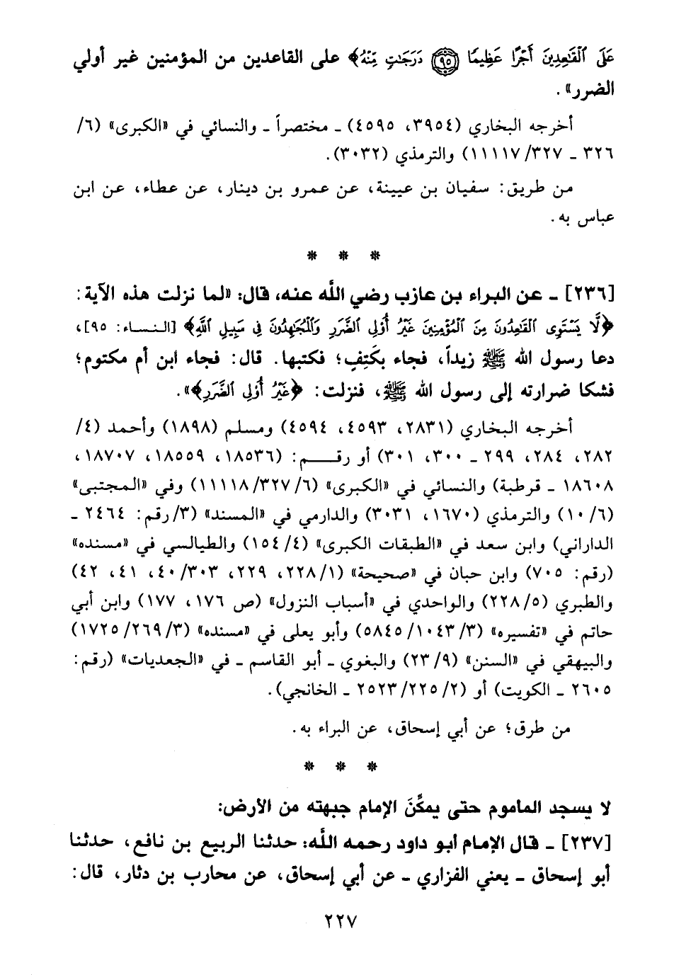 236 - عن البراء بن عازب - رضي الله عنه -، قال: "لما نزلت هذه الآية: {لَا يَسْتَوِي الْقَاعِدُونَ مِنَ الْمُؤْمِنِينَ غَيْرُ أُولِي الضَّرَرِ وَالْمُجَاهِدُونَ فِي سَبِيلِ اللَّهِ} [النساء: 95]، دعا رسول الله - صلى الله عليه وسلم - زيدًا، فجاء بكَتِفِ؛ فكتبها. قال: فجاء ابن أم مكتوم؛ فشكا ضرارته إلي رسول الله - صلى الله عليه وسلم -، فنزلت: {غَيْرُ أُولِي الضَّرَرِ} ".