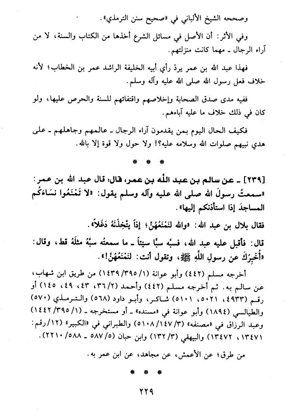 239 - عن سالم بن عبد الله بن عمر، قال: قال عبد الله بن عمر: "سمعت رسولَ الله - صلى الله عليه وآله وسلم - يقول: "لا تَمْنَعُوا نسَاءَكُم المساجدَ إذا استأذنكم إليها".