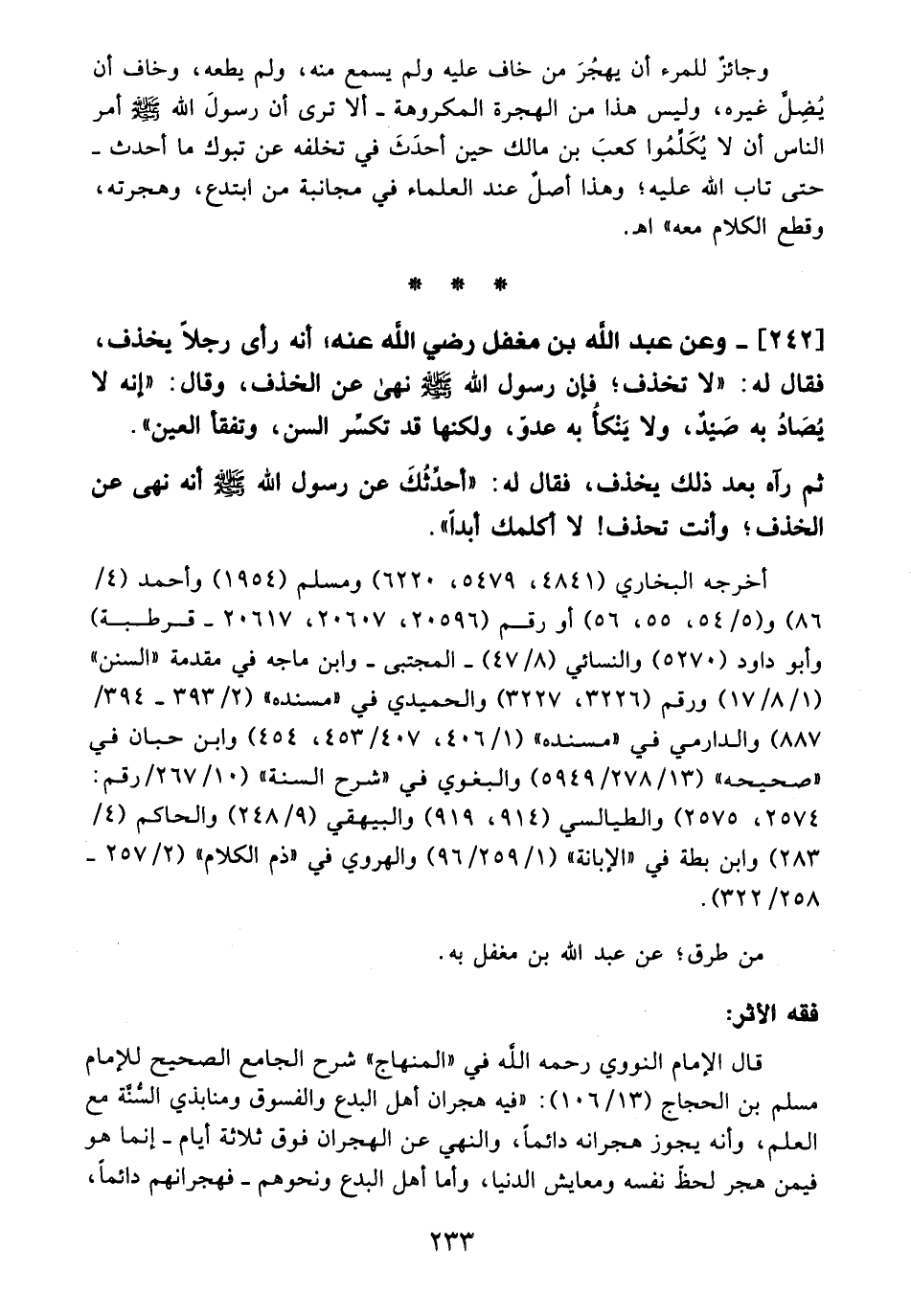 242 - وعن عبد الله بن مغفل - رضي الله عنه -، أنه رأى رجلًا يخذف، فقال له: "لا نخذف؛ فإن رسول الله - صلى الله عليه وسلم - نهى عن الخذف، وقال: "إنه لا يُصَادُ به صَيدٌ، ولا يَنكأُ به عدوّ، ولكنها قد تكسِّر السن، وتفقأ العين".