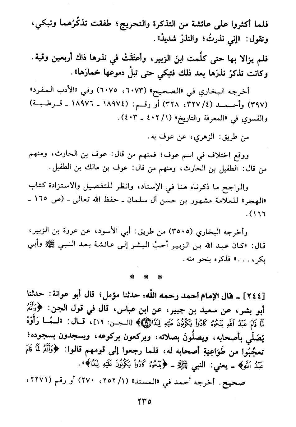 244 - قال الإمام أحمد -رَحِمَهُ اللهُ-: حدثنا مؤمل؛ قال أبو عوانة: حدثنا أبو بشر، عن سعيد بن جبير، عن أبن عباس، قال في قول الجن: {وَأَنَّهُ لَمَّا قَامَ عَبْدُ اللَّهِ يَدْعُوهُ كَادُوا يَكُونُونَ عَلَيْهِ لِبَدًا} [الجن: 19] [الجن: 19]، قال: "لما رَأَوْهُ يُصَلي بأصحابه، ويصلُّونَ بصلاته، ويركعون بركوعه، ويسجدون بسجوده؛ تعجَّبُوا من طَوَاعِيَةِ أصحابه له، فلما رجعوا إلى قومهم قالوا: {وَأَنَّهُ لَمَّا قَامَ عَبْدُ اللَّهِ} -يعني: النبي - صلى الله عليه وسلم - {يَدْعُوهُ كَادُوا يَكُونُونَ عَلَيْهِ لِبَدًا} ".