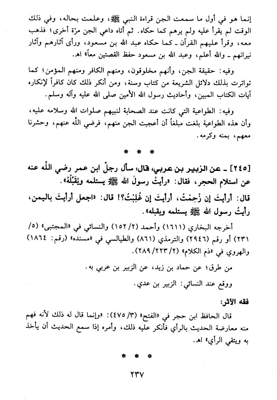 245 - عن الزبير بن عربي، قال: سأل رجلٌ ابن عمر - رضي الله عنه - عن استلام الحجر، فقال: "رأيتُ رسولَ الله - صلى الله عليه وسلم - يستلمه ويُقَبلُهُ".