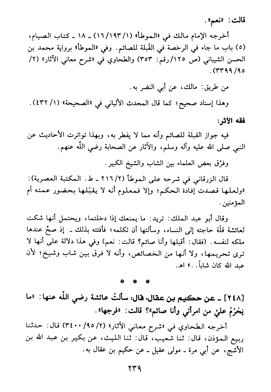 248 - عن حكيم بن عقال، قال: سألتُ عائشة - رضي الله عنها -: "ما يَحرُمُ عليَّ من امرأتي وأنا صائم"؟ قالت: "فرجها".