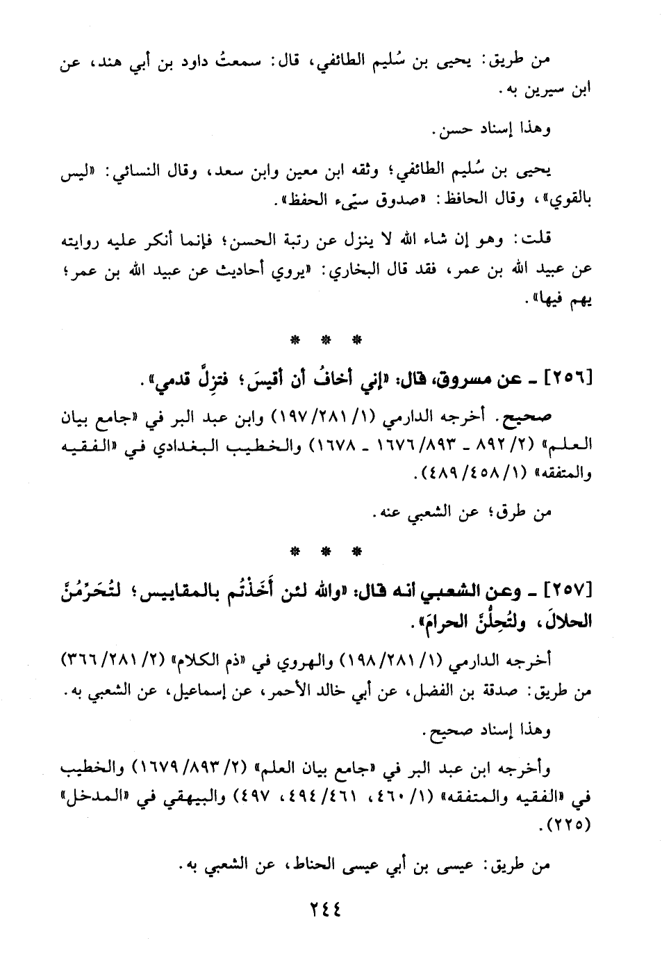 256 - عن مسروق، قال: "إني أخافُ أن أقيسَ؛ فتزِلَّ قدمي".